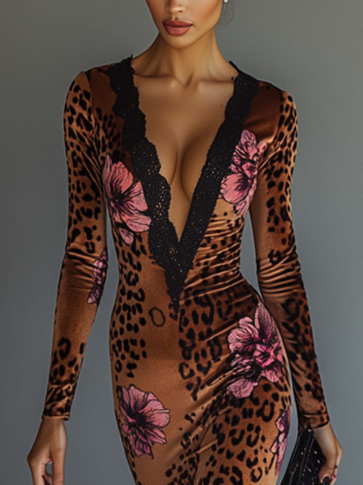 Design: Features a bold mix of leopard spots and large pink floral prints, creating a daring yet feminine aesthetic. The dress is accented with a plunging V-neckline trimmed in black lace, adding a seductive and elegant detail.