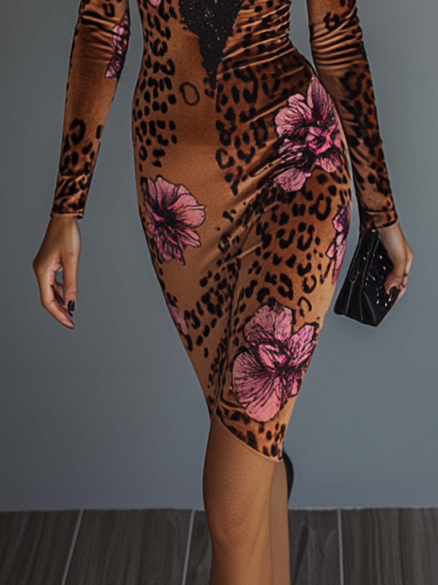 This brown velvet dress masterfully balances fierceness and femininity with its leopard and floral print combination. The black lace trim along the deep V-neckline injects a touch of sensual sophistication. Its bodycon fit ensures a sleek, glamorous look that makes it a perfect choice for high-impact, stylish occasions.