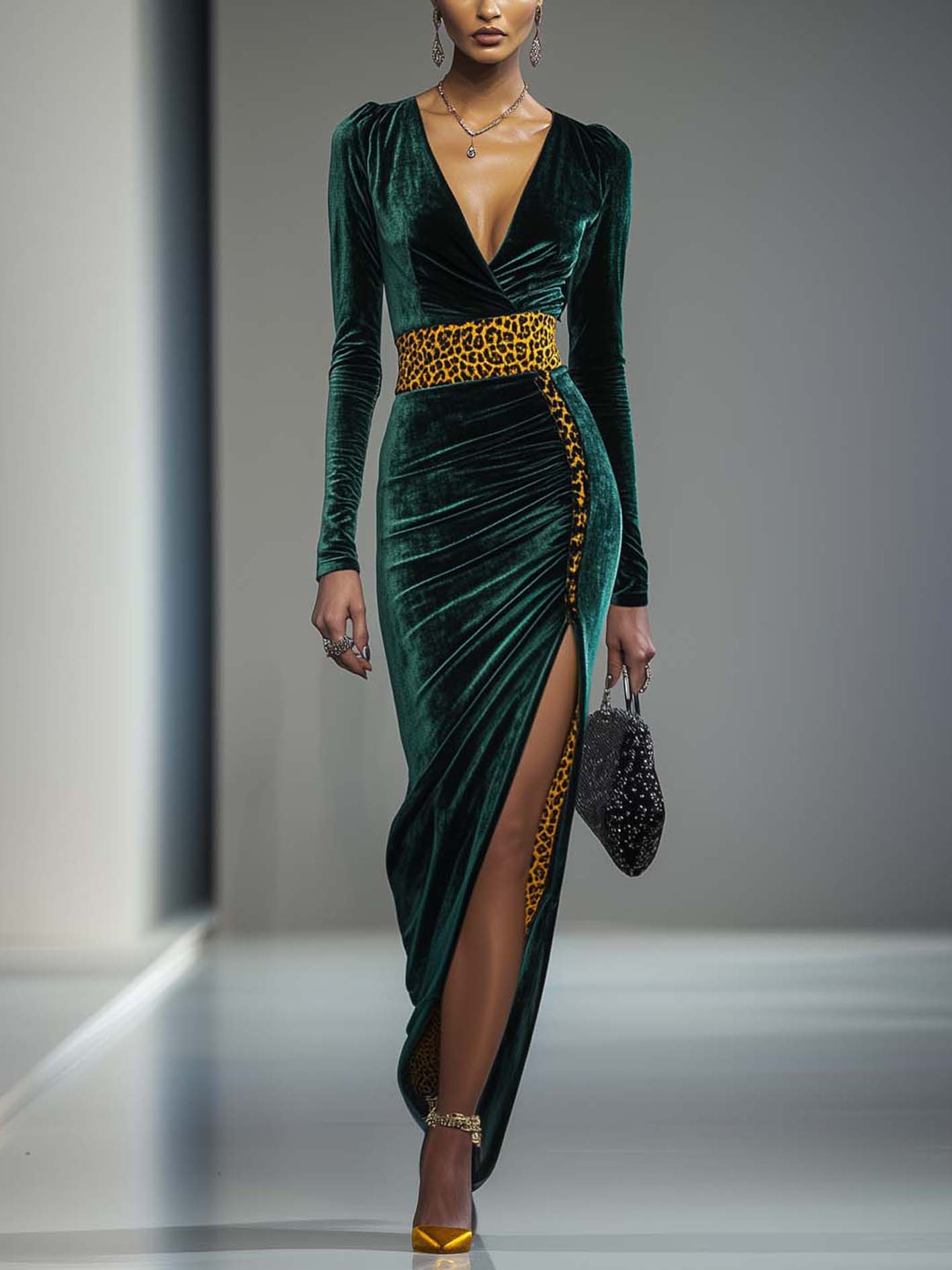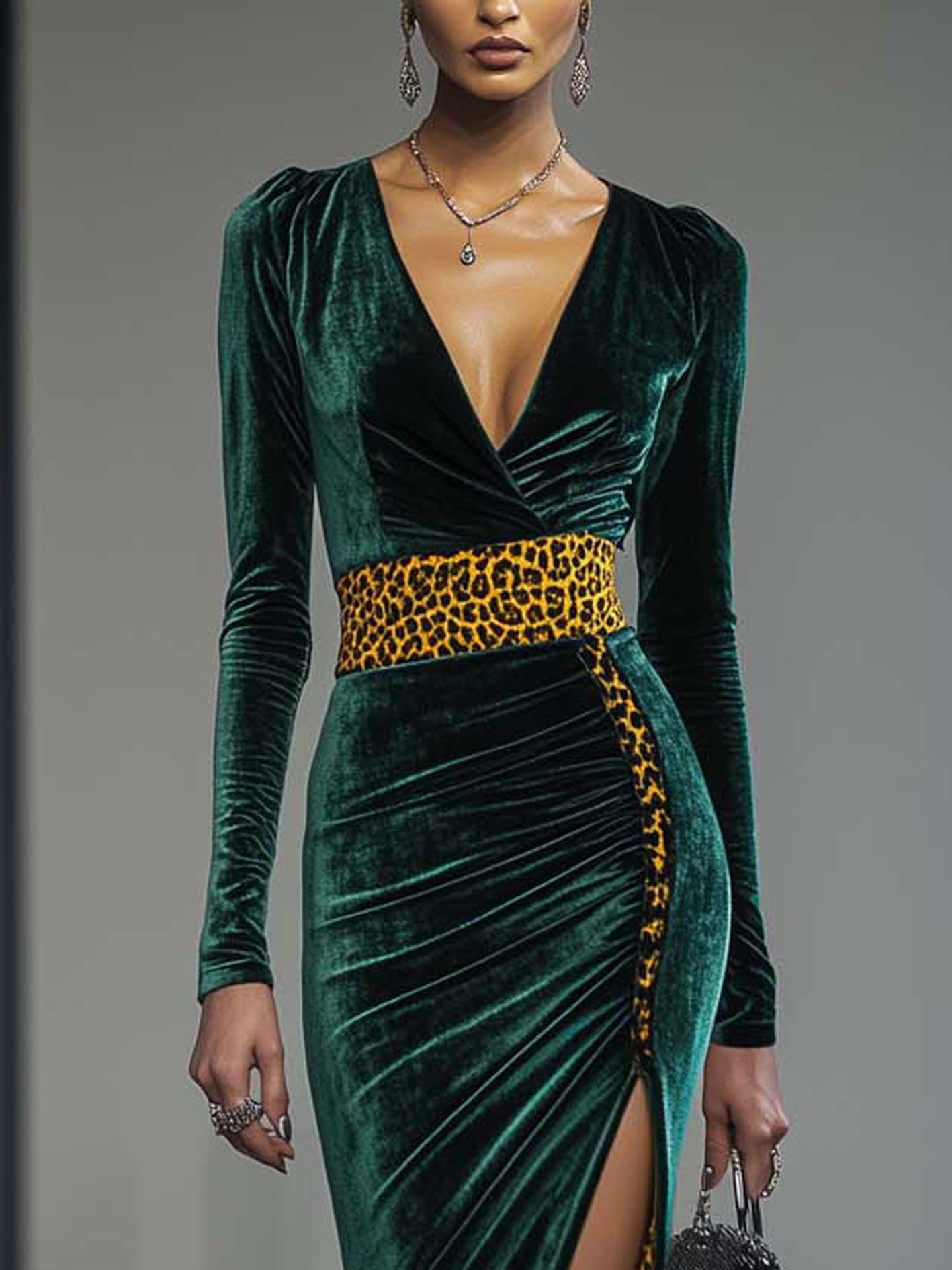 Dark Green Velvet Front Slit Bodycon Dress With Yellow Leopard Print