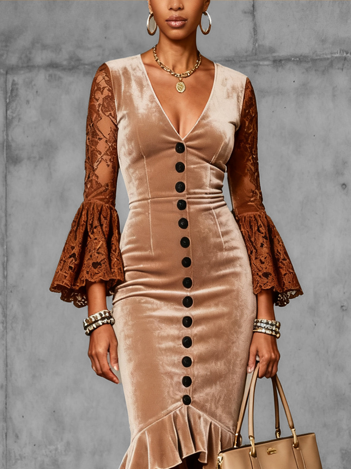 Design: Features a deep V-neck and bell sleeves adorned with intricate lace, leading down to a row of bold black buttons. The ruffled hemline adds a playful yet sophisticated touch, creating a perfect balance between elegance and flair.