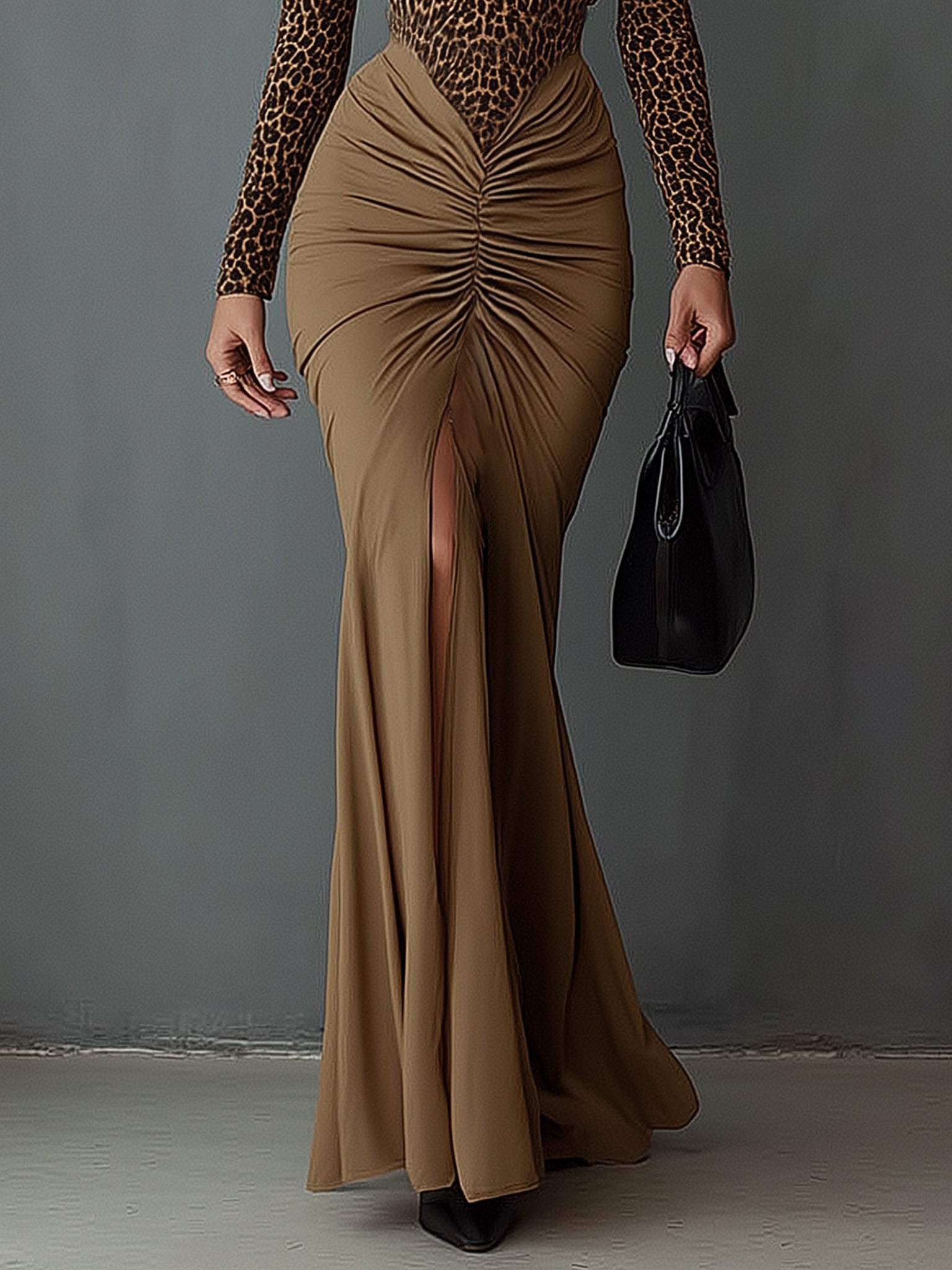 2. Design: A bold combination of a leopard print bodice and a ruched khaki skirt creates a statement-making silhouette. The plunging deep V-neckline and padded shoulders emphasize a powerful feminine elegance, while the front slit adds a dramatic and sultry detail.