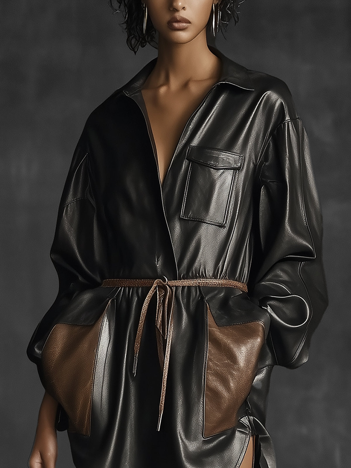 Black Faux Leather Belted Tunic Dress With Brown Accents