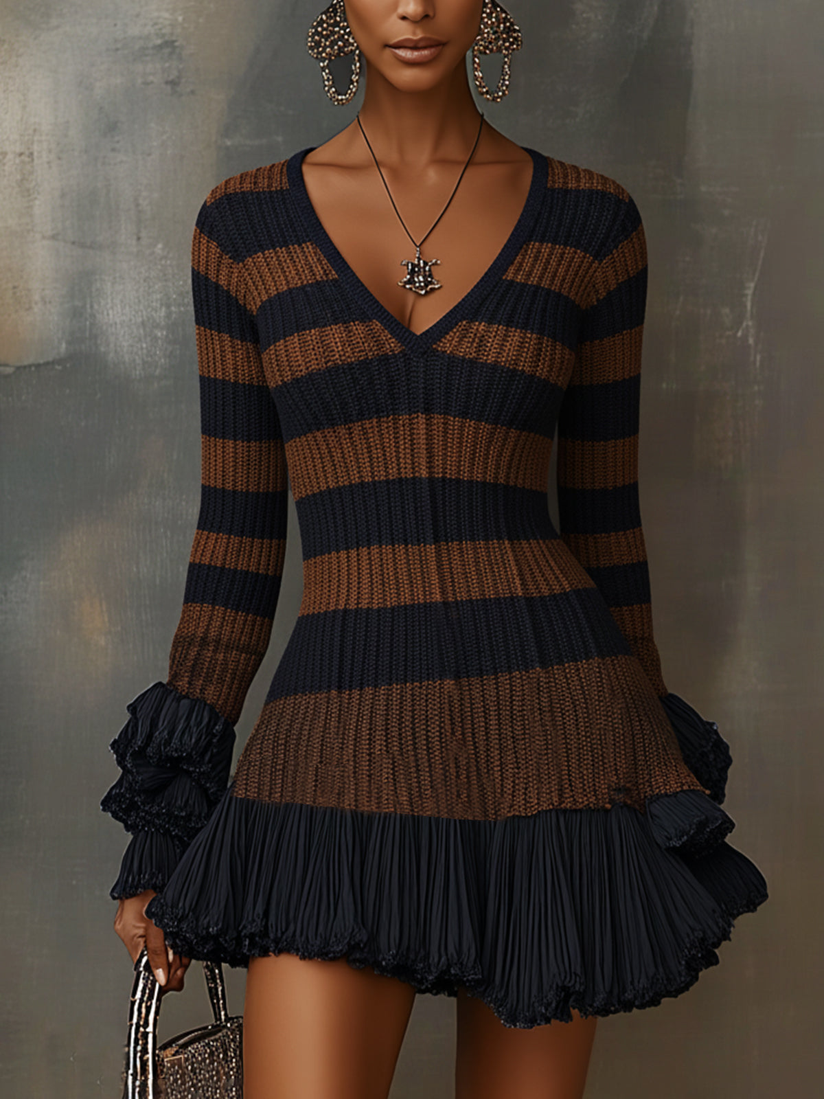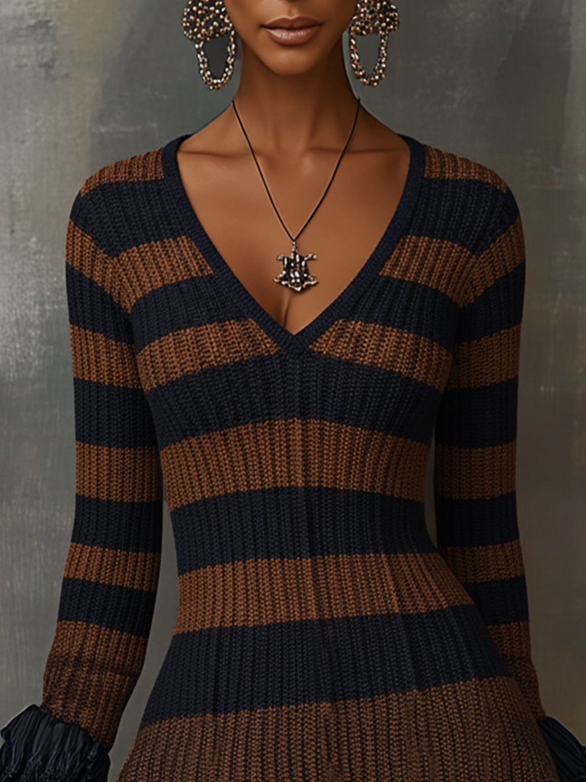 2. Design: Stylish navy and brown horizontal stripes with a playful yet refined flair, featuring a V-neckline and dramatic ruffled cuffs and hem.