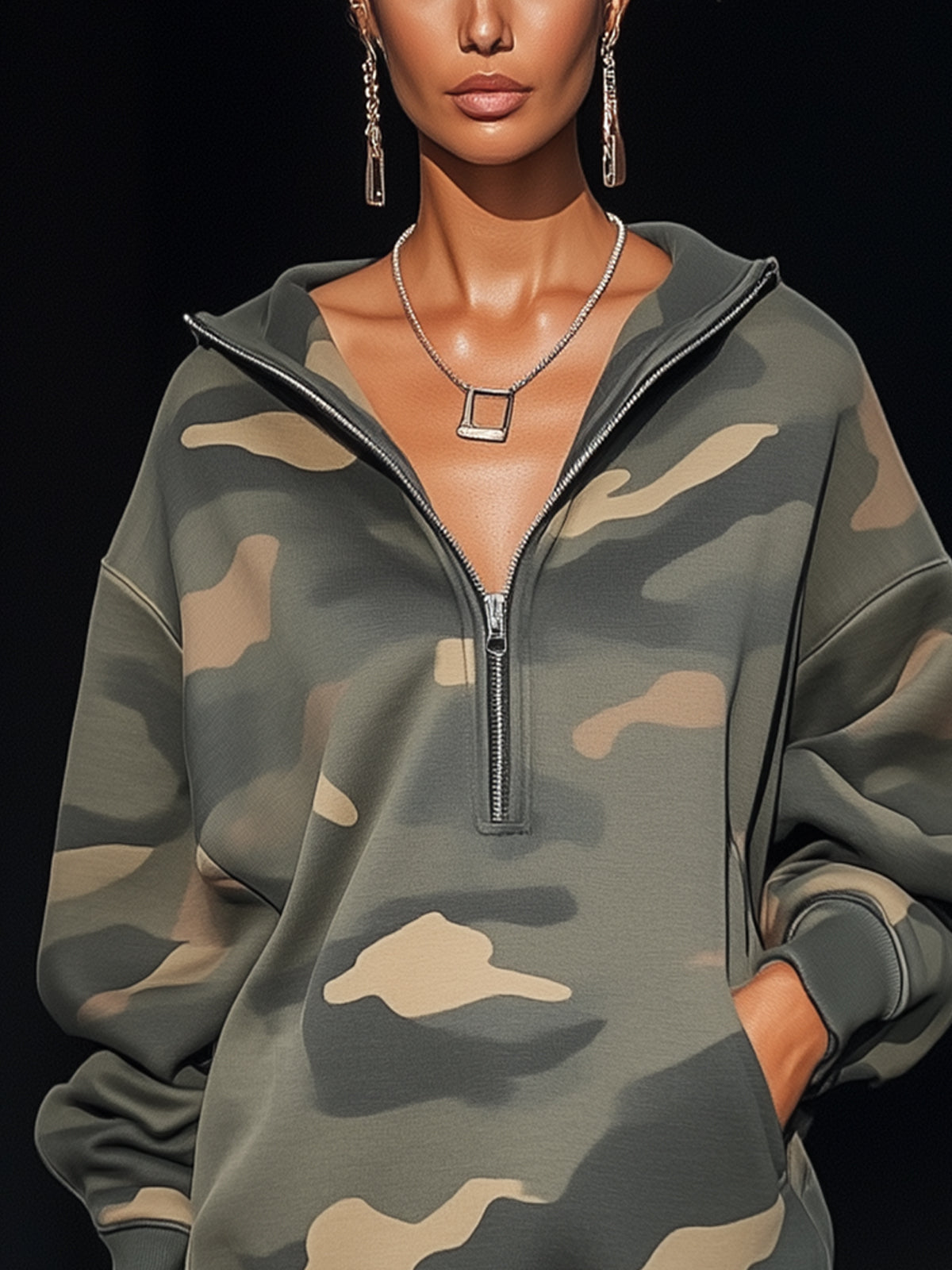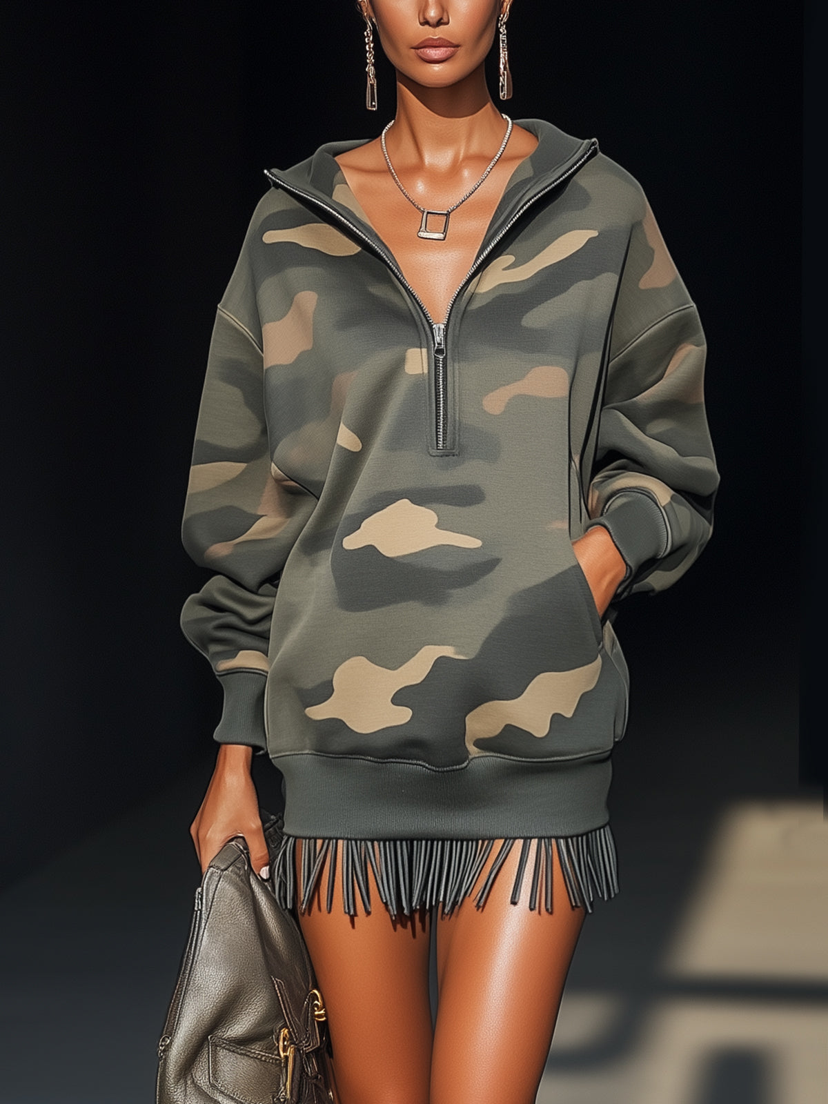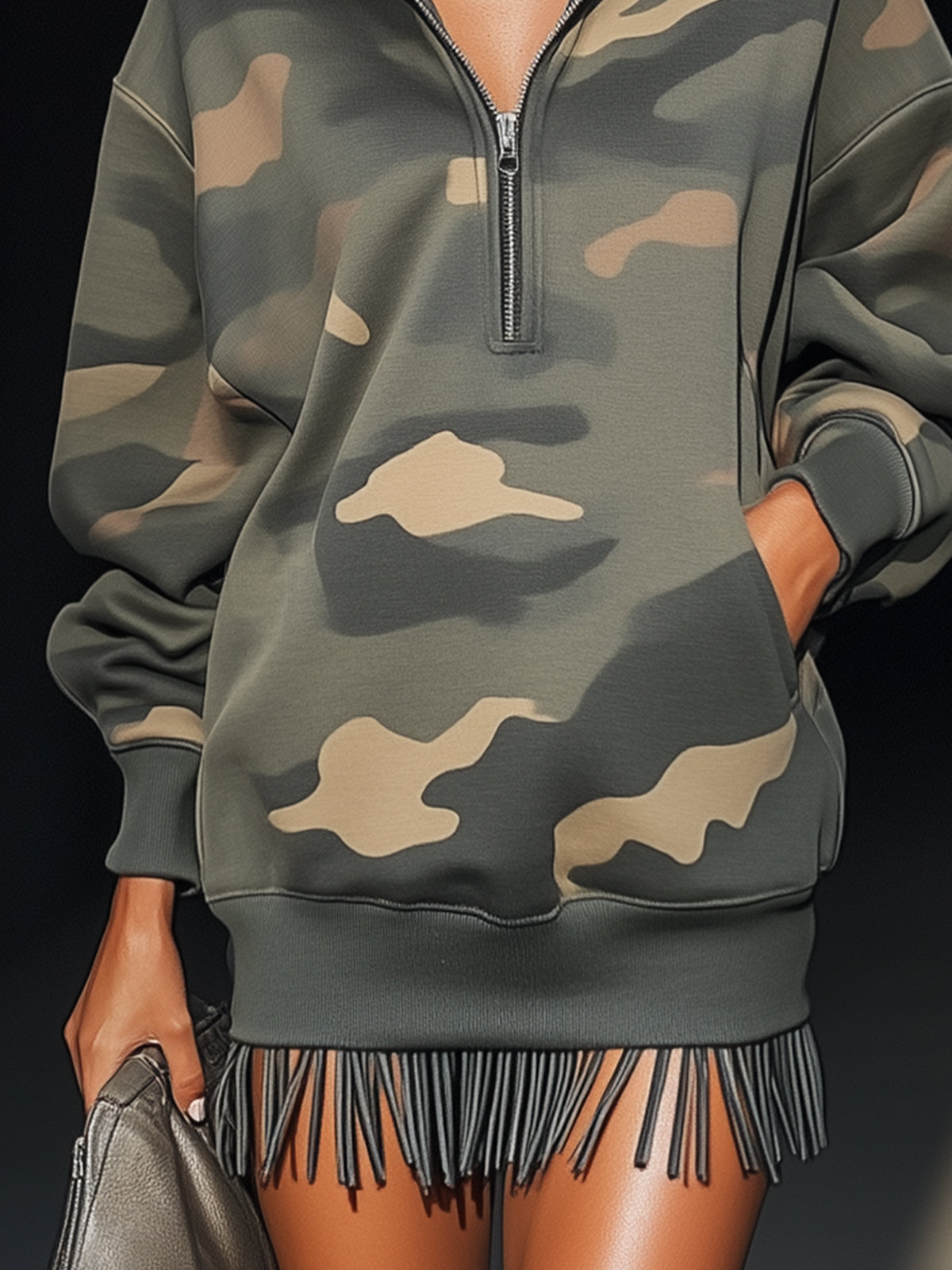 This camouflage sweatshirt dress combines laid-back cool with a dash of edge. The fringe hem provides a playful twist, making it perfect for pairing with boots or sneakers.
