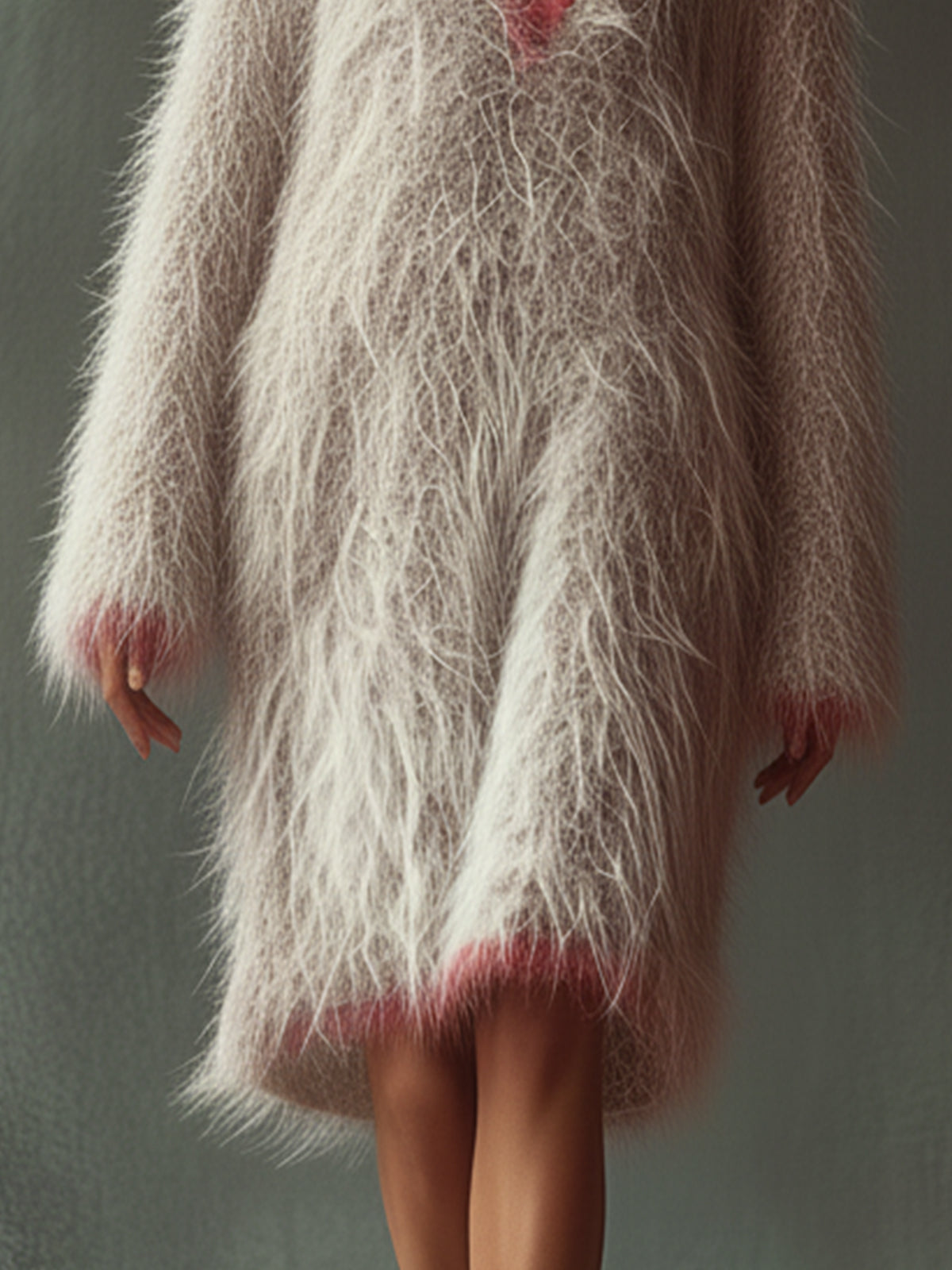 Material: Crafted from a luxurious, soft angora blend, this dress offers warmth and a dreamy texture. The fabric is enhanced with subtle pink accents at the edges for a touch of color and elegance.
