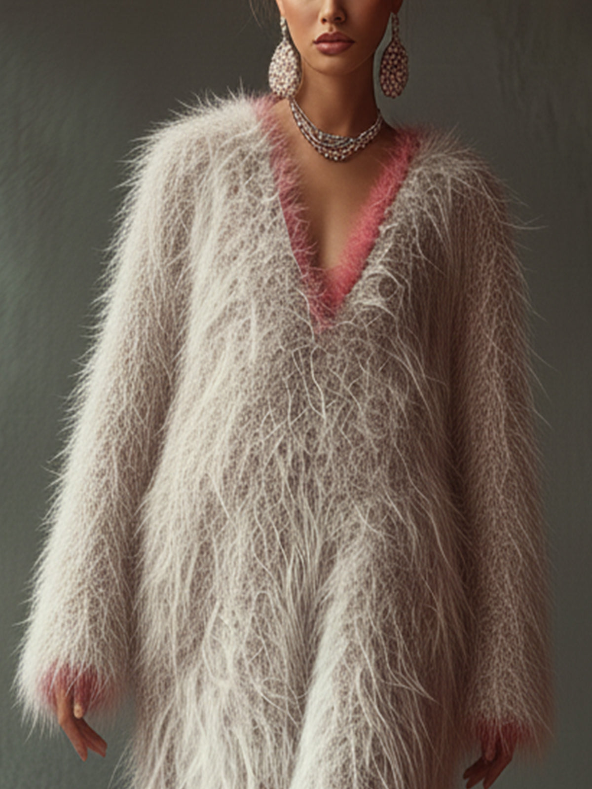 Design: Featuring a deep V-neckline, the dress is designed to drape softly over the body, accentuating its fluffy texture. The long sleeves and relaxed fit make it a standout piece.