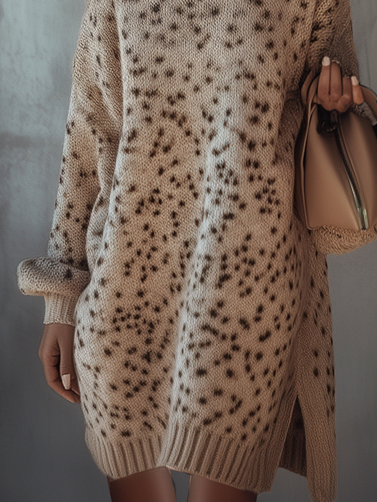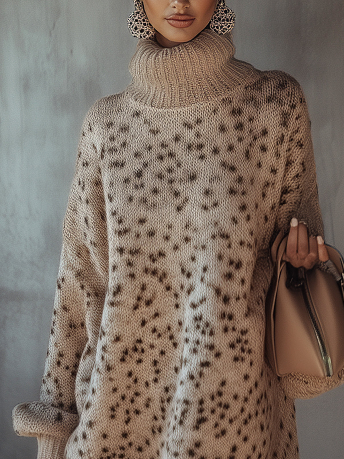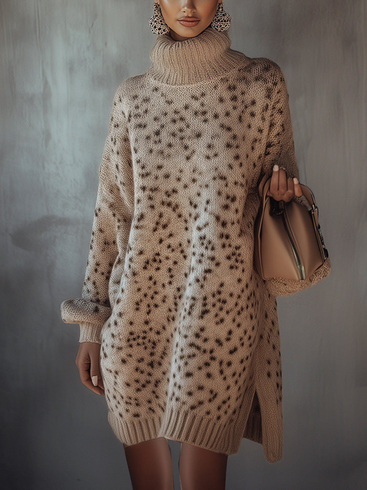 2. Design: A light beige dress adorned with delicate dark speckles, featuring a classic turtleneck, long sleeves, and a relaxed fit for effortless elegance.