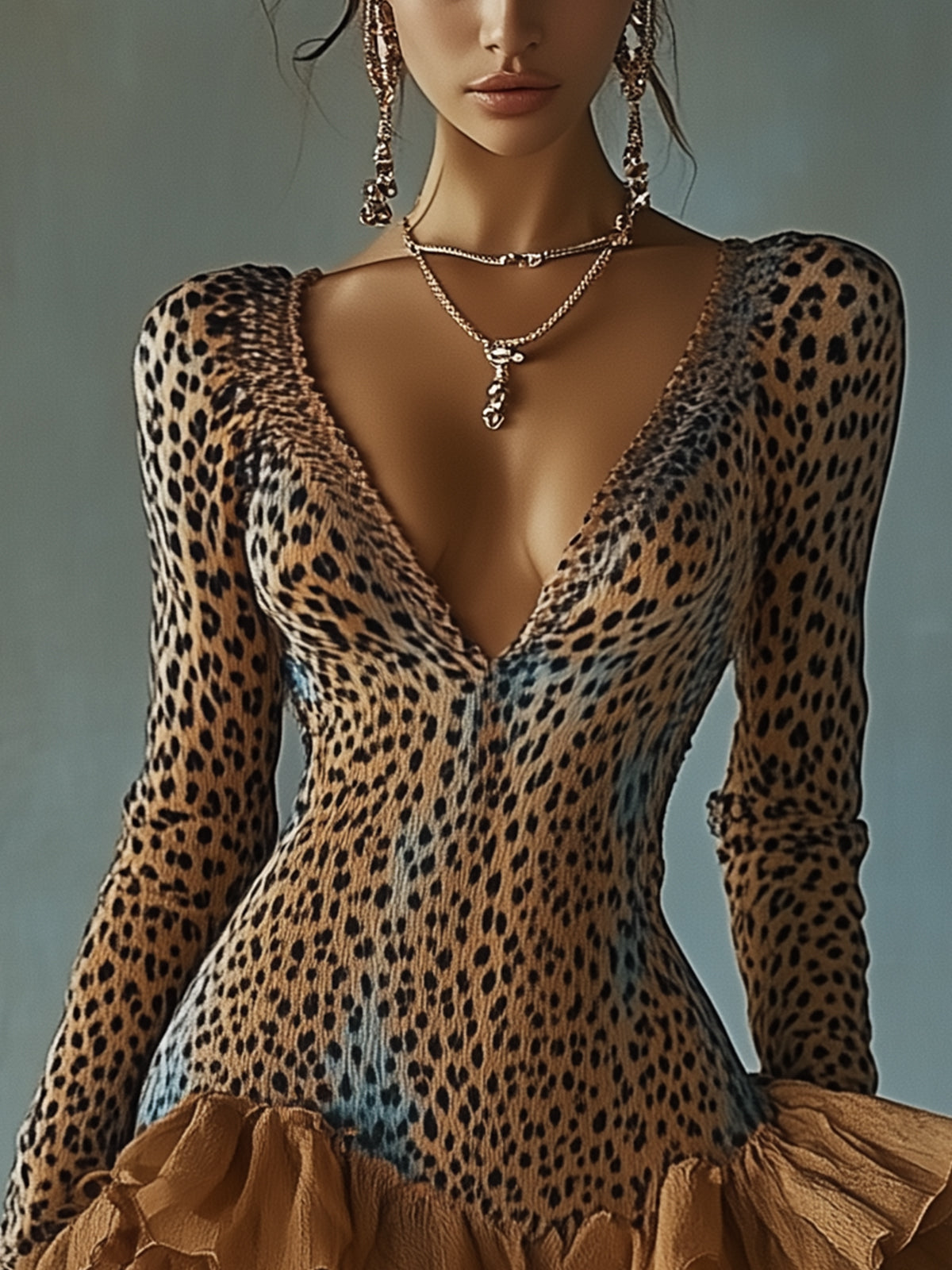 This vibrant leopard print mini dress exudes confidence with its striking pattern and playful ruffled hem. The deep V-neckline and body-hugging fit create an alluring silhouette, perfect for those looking to highlight their bold and adventurous side. The whimsical ruffles add a lively touch, enhancing the overall appeal for night events or social gatherings.
