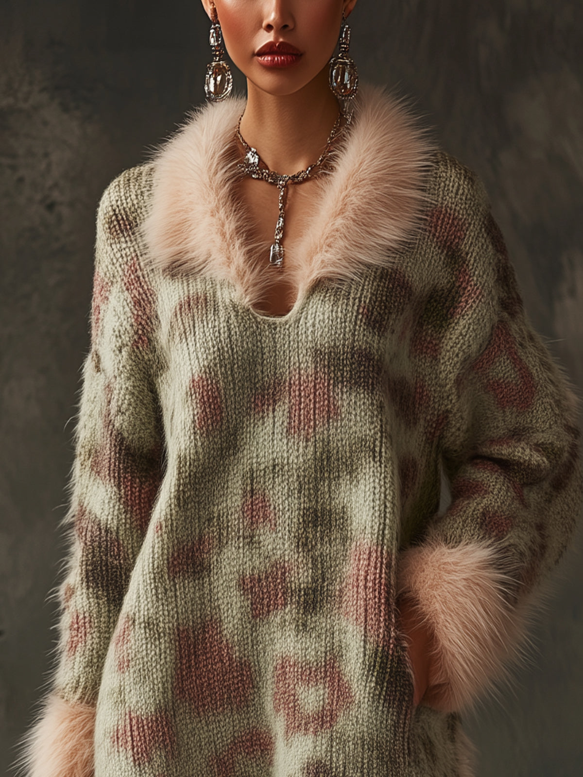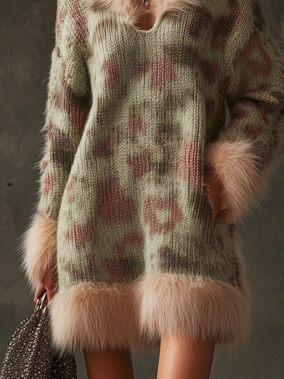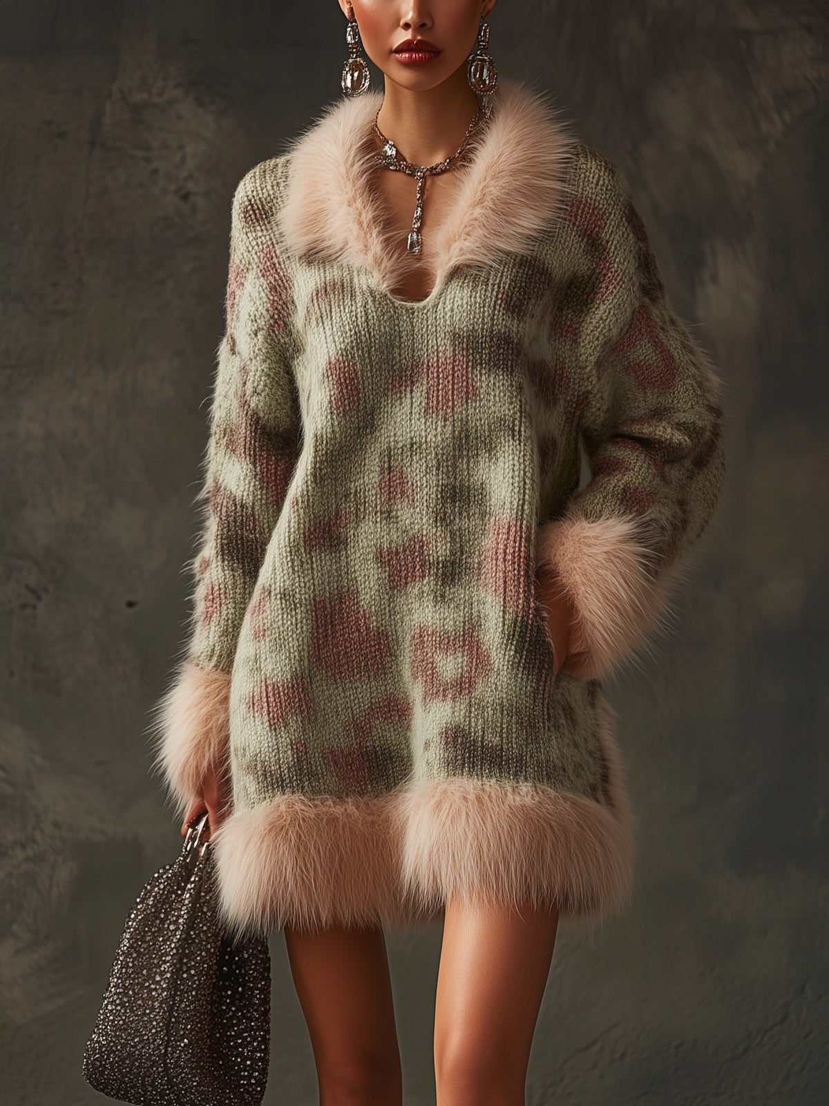 1. Material: Crafted from a soft, cozy knit in a gentle light sage hue. The dress is adorned with lavish faux fur trim, providing warmth and a touch of luxury. The abstract print subtly enhances the texture and color of the fabric.