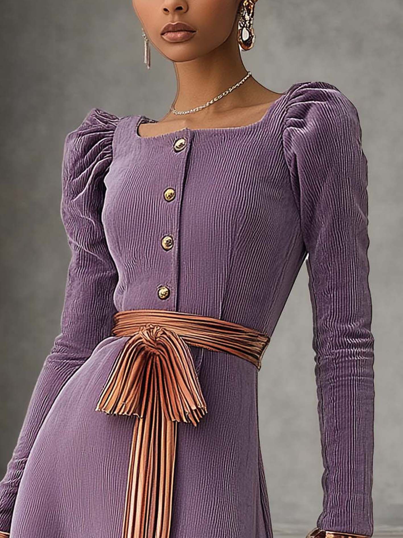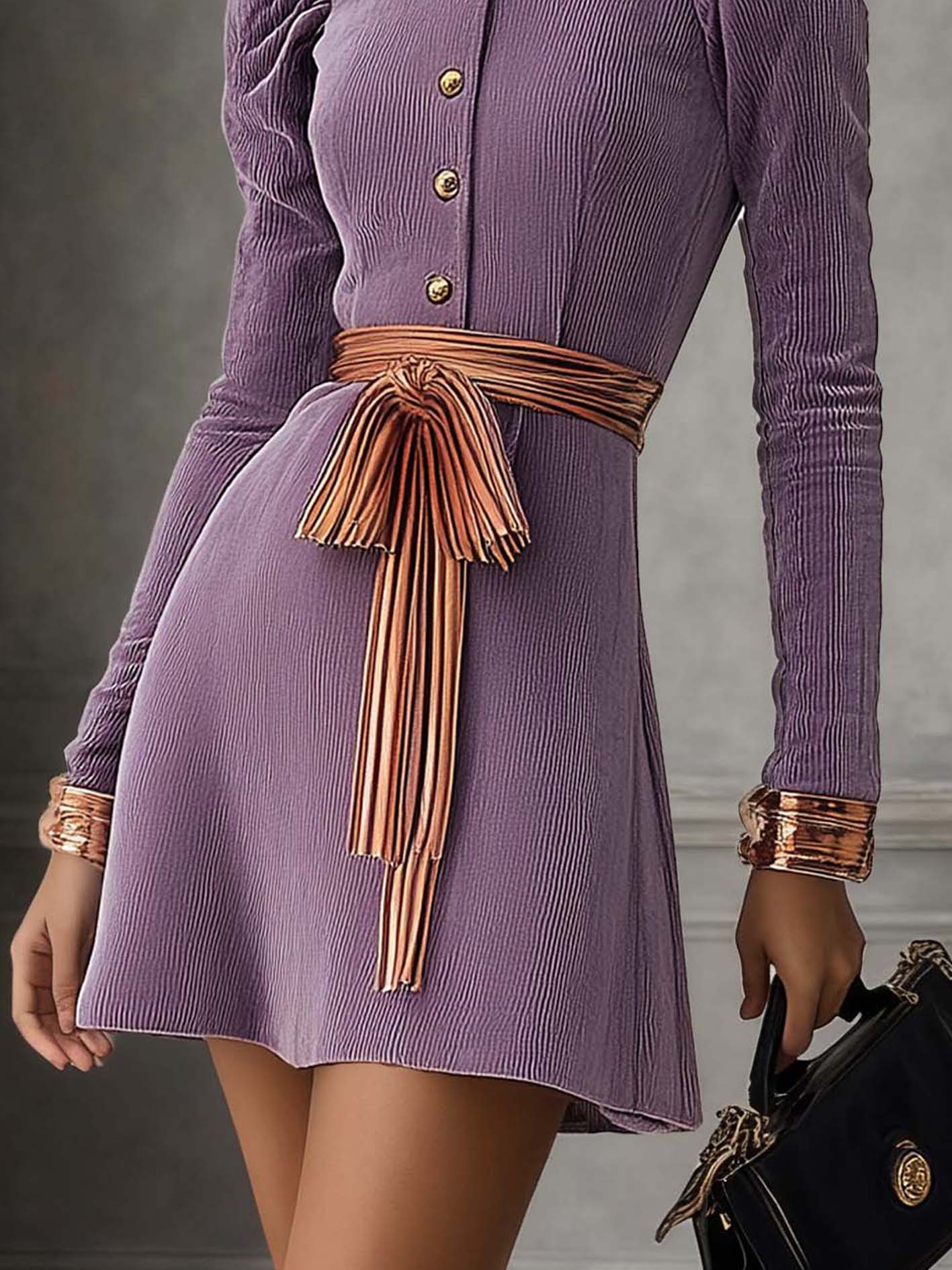 Light Purple Corduroy Mini Dress With A Champagne Belt