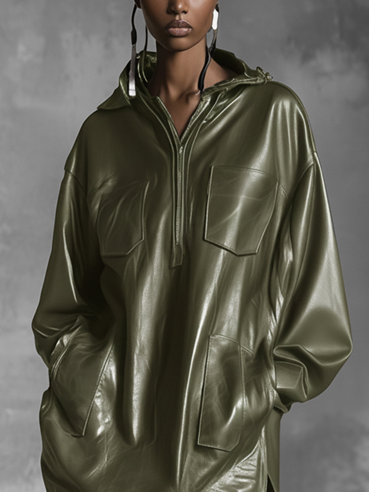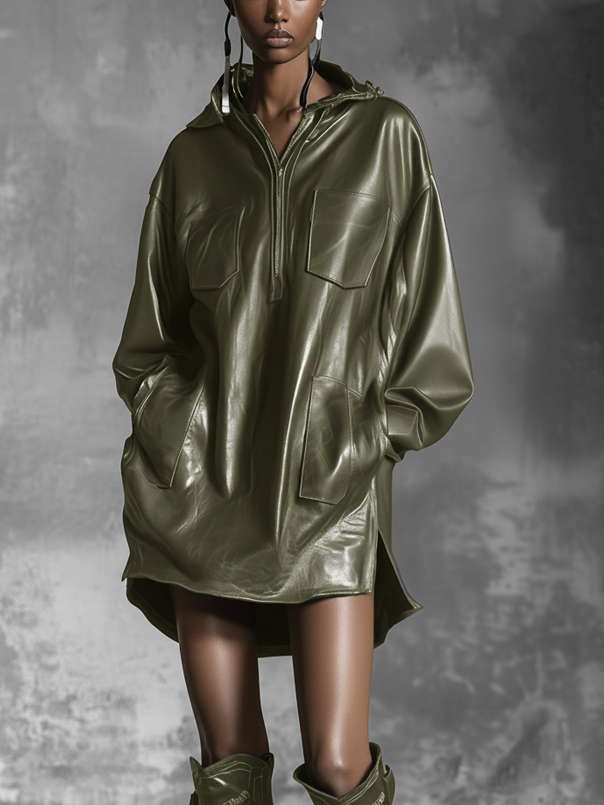 Olive Green Faux Leather Hooded Dress With Pockets