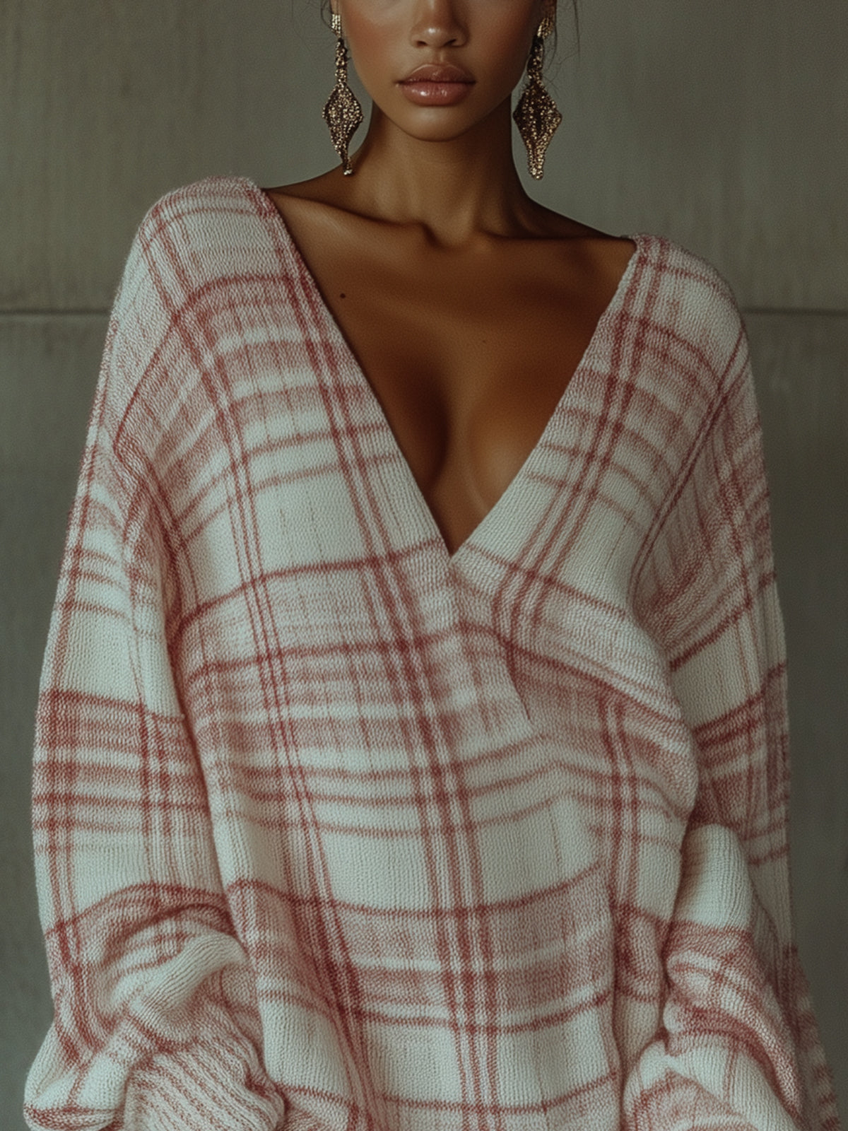 2.Design: This oversized sweater dress features a cream and blush plaid pattern with a deep V-neckline, creating a cozy yet stylish look. The loose sleeves and relaxed fit add to its comfy charm.