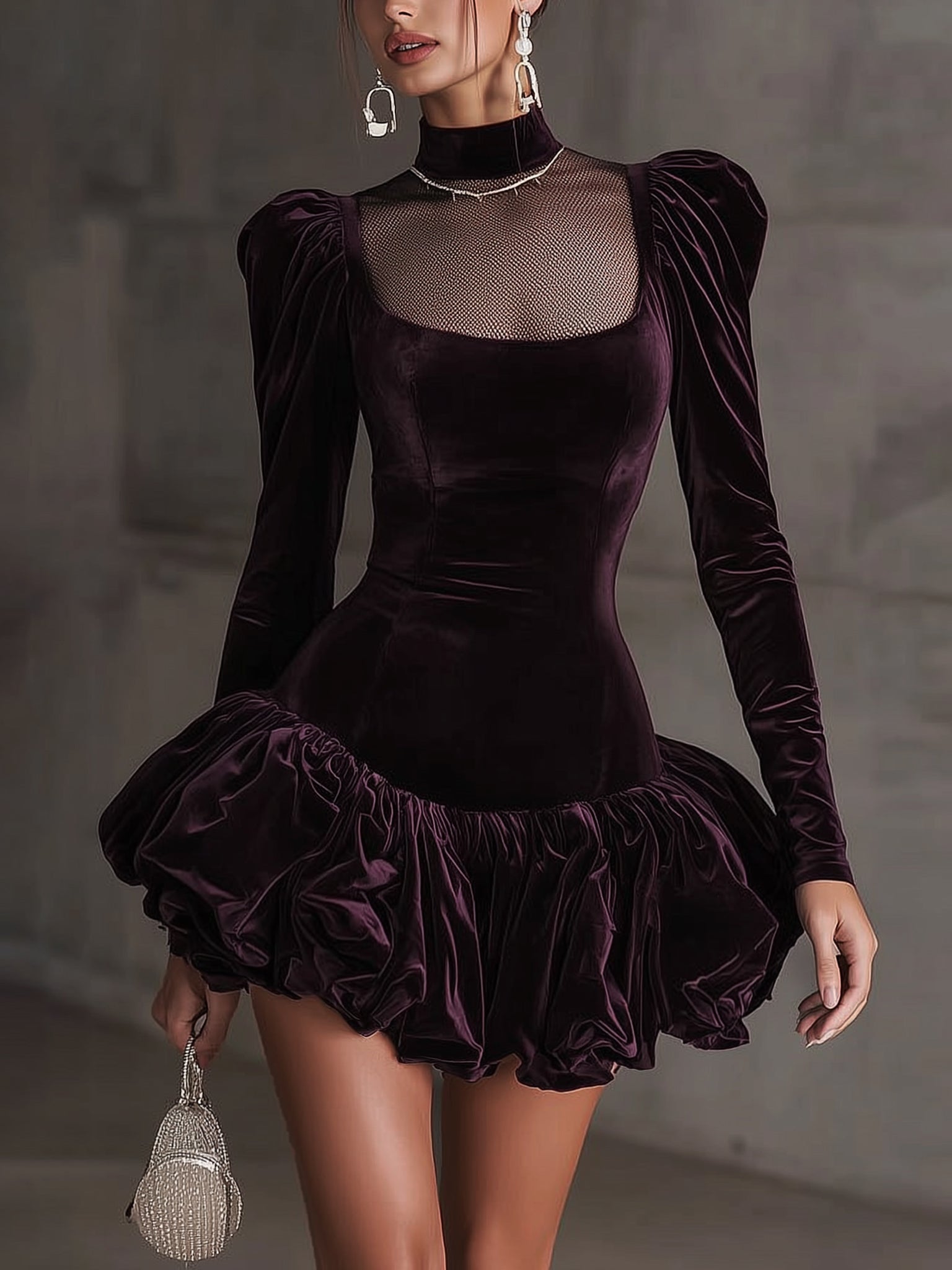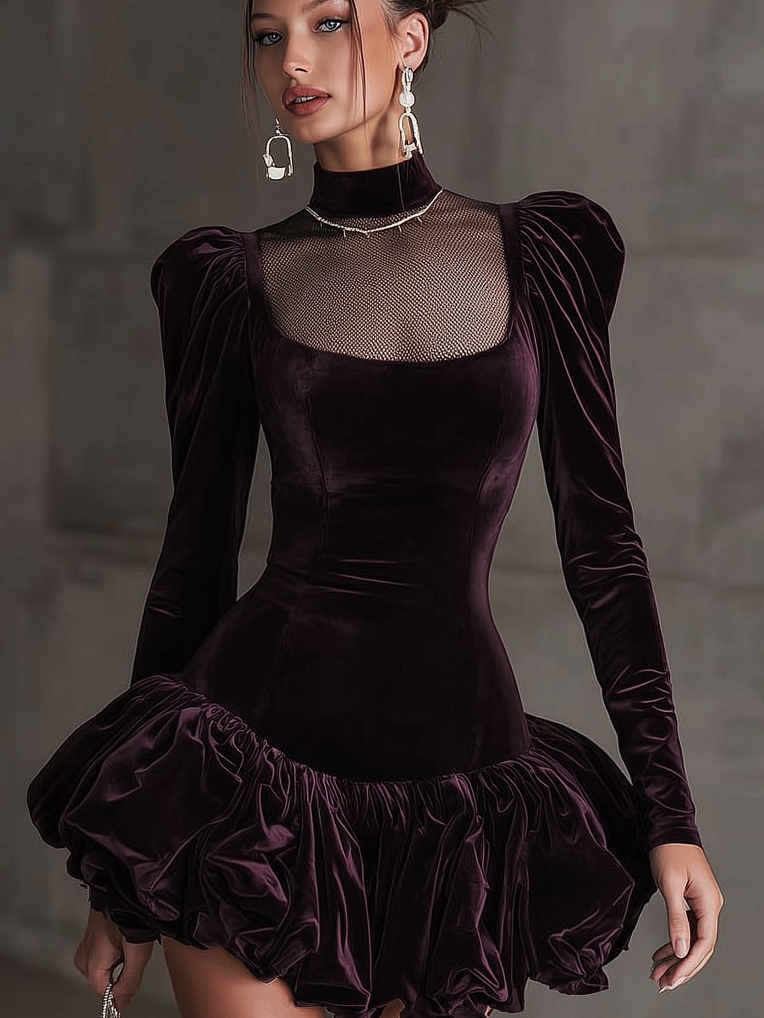Step into a world of decadent drama with the Plum Velvet Mesh Panel Puff Sleeve Mini Dress. Designed to dazzle, this dress combines classic opulence with fierce modernity. The bold puffed sleeves and flouncy ruffle hem exude confidence and movement, while the sheer panel detail adds just the right touch of seductive mystery. Glam it up with chandelier earrings, a bejeweled clutch, and stilettos for a high-fashion finish. It’s the ultimate power piece for the fearless fashionista.