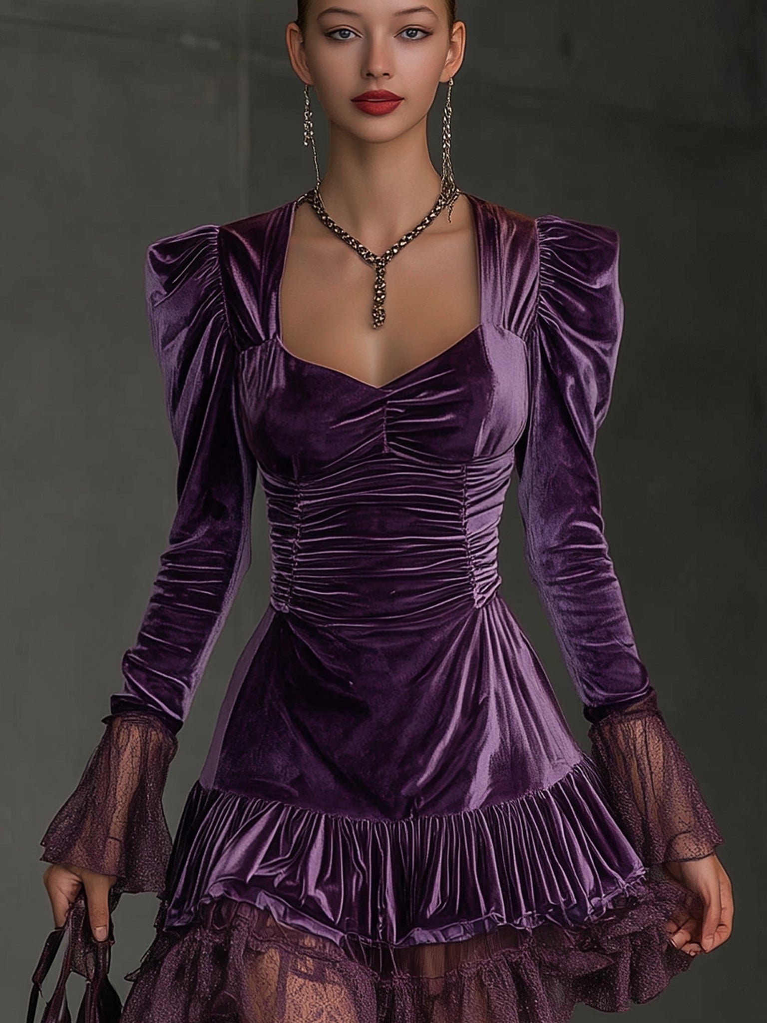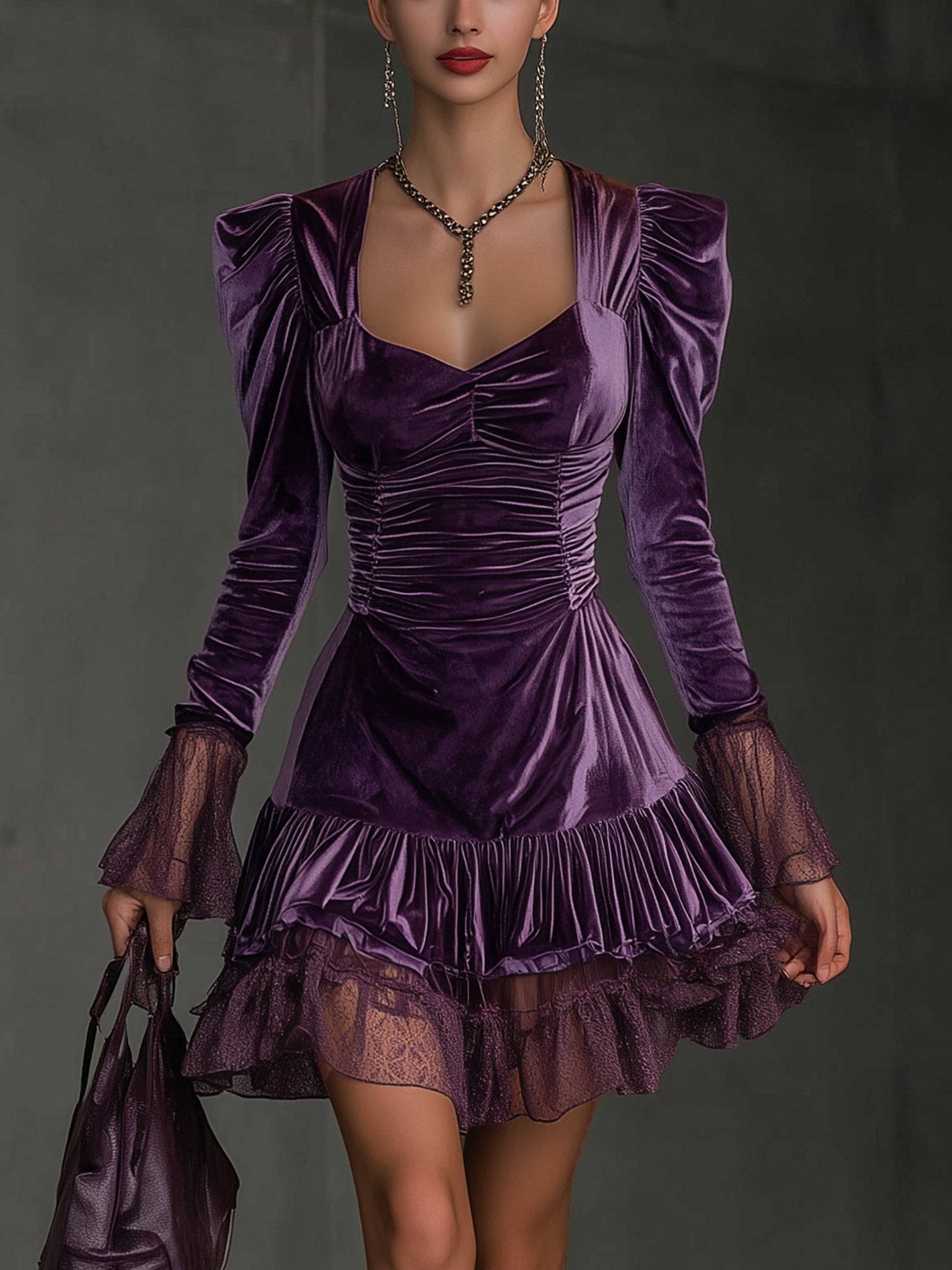 Material: Made from rich, plush velvet in an opulent purple hue, this mini dress combines a soft, luxurious hand feel with a shimmering finish that captures light with every movement.