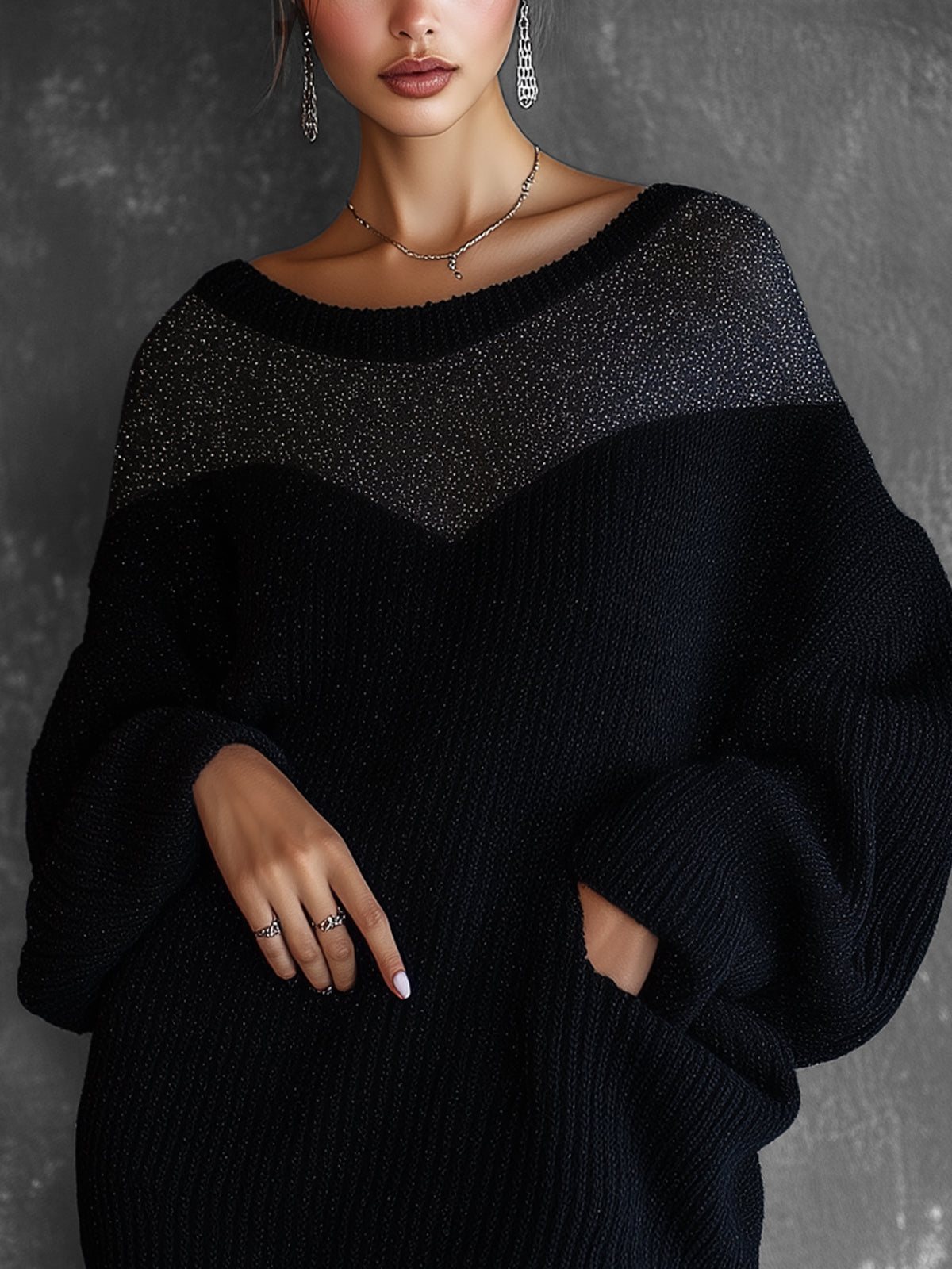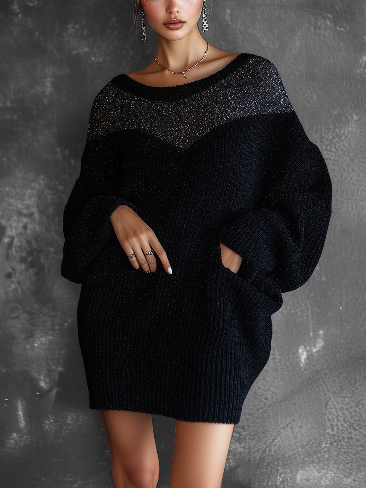 This black knit sweater dress combines a cozy oversized fit with shimmering detail for a sophisticated touch. Ideal for pairing with ankle boots or heels, it creates an effortless, stylish ensemble.