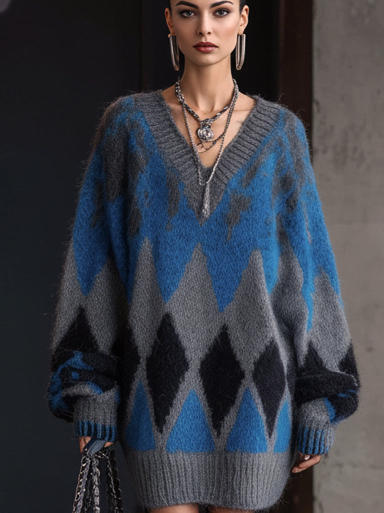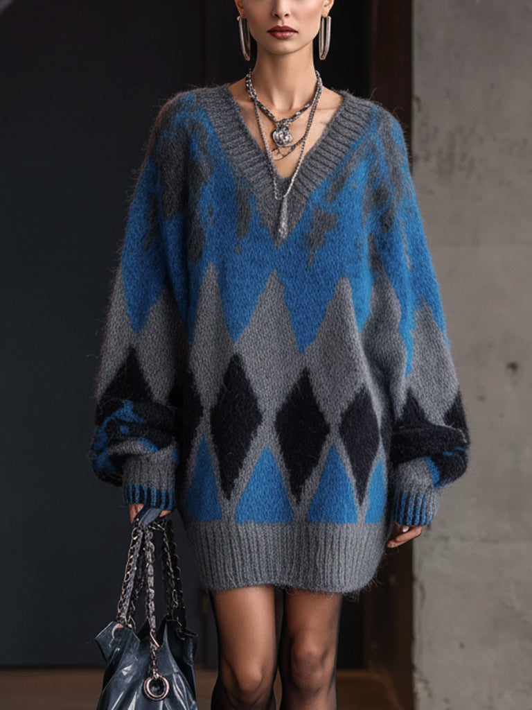 Design: Featuring a bold argyle pattern in shades of charcoal, black, and vivid blue, the dress blends retro charm with contemporary edge. The deep V-neckline, dropped shoulders, and exaggerated long sleeves enhance its relaxed, oversized silhouette. Rib-knit cuffs and hem offer structure and contrast to the soft, voluminous body.
