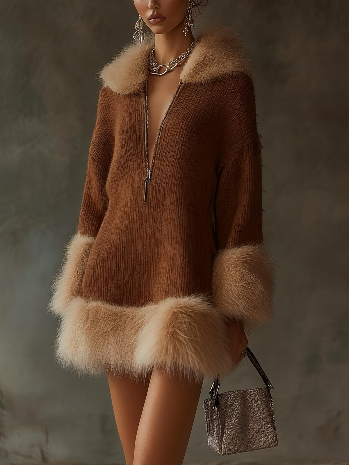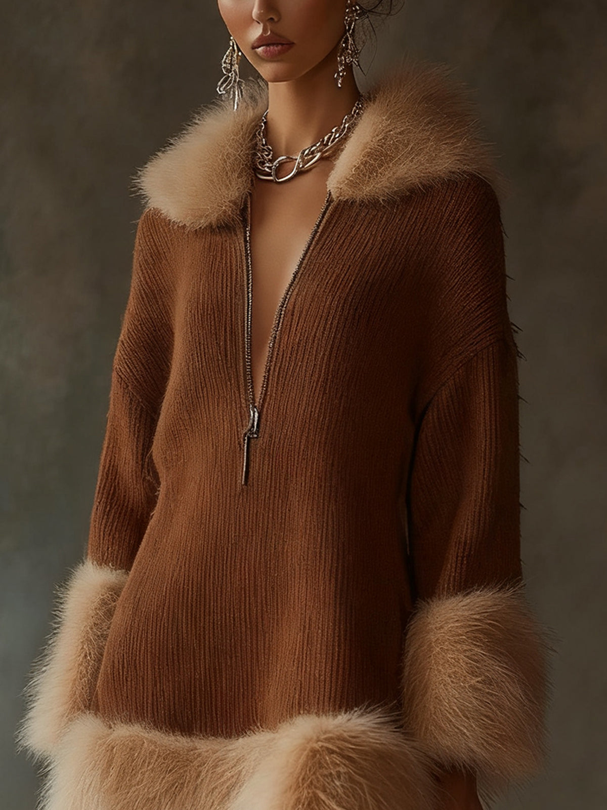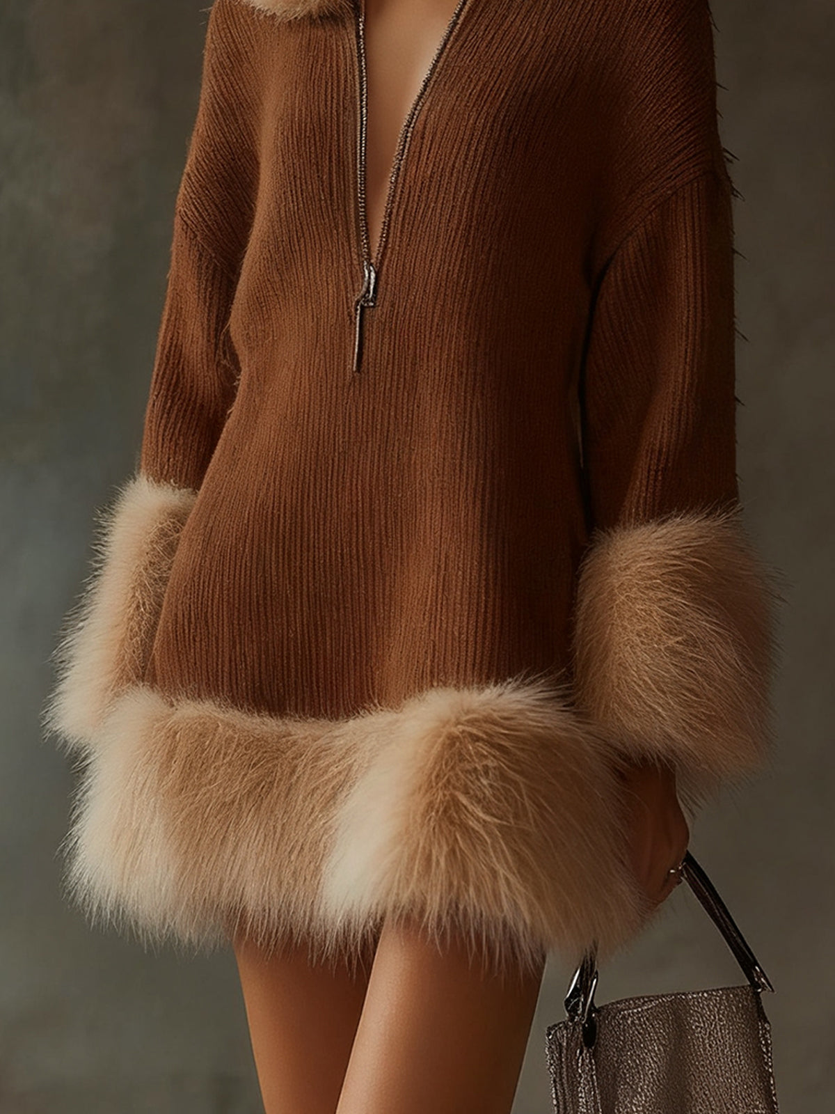 This cinnamon ribbed knit dress with faux fur trim is a striking piece that merges elegance with cozy functionality.