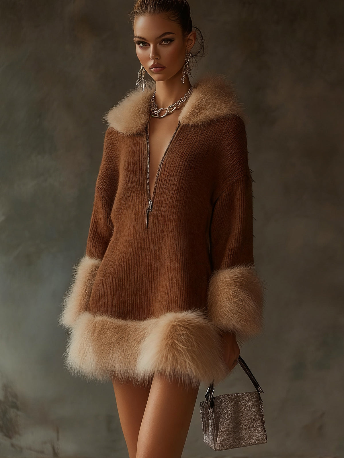 Brown Ribbed Knit Dress With Faux Fur Trim And Front Zip
