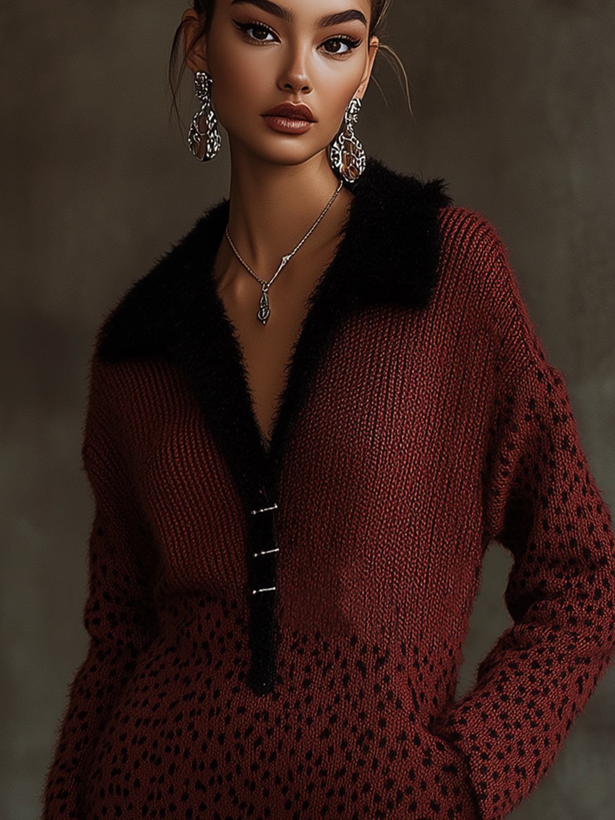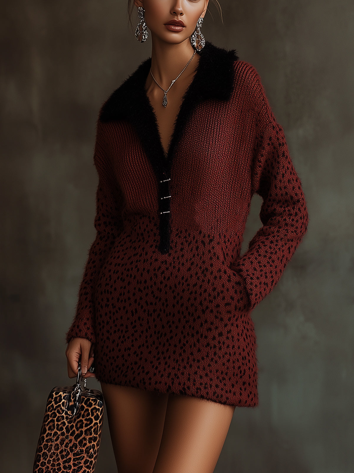 This burgundy knit dress with a faux fur collar and leopard print accents is both fashionable and versatile. It combines cozy fabrics with bold design, making it an ideal choice for those looking to make a statement.