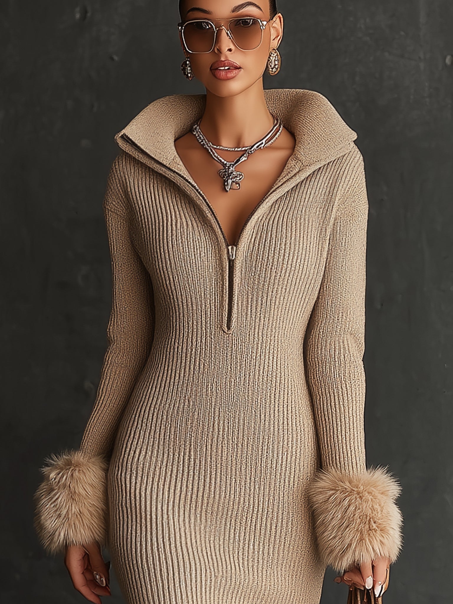 2. Design: This fitted mini dress features a zippered front with an open collar neckline for adjustable styling—from cozy chic to effortlessly sultry. The standout element is the voluminous faux fur sleeve cuffs, which add a glamorous, winter-ready touch.