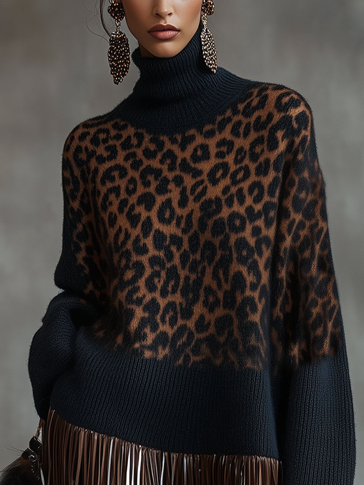This turtleneck sweater dress combines bold style with luxurious comfort. The leopard pattern and fringe hem add dynamic flair, making it a standout piece. Pair with thigh-high boots for an edgy, high-fashion outfit. Accessorize with statement earrings and a textured bag to complement the sweater’s daring design.