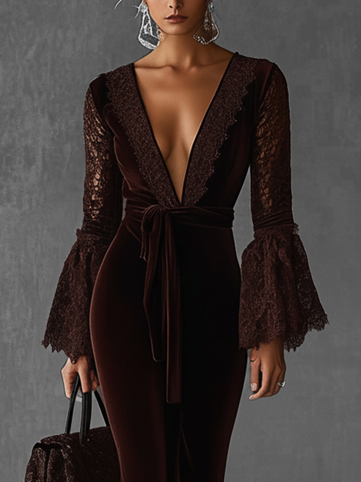 This deep brown velvet dress captivates with its luxurious feel and bold design elements. The plunge neckline adds allure, while the lace bell sleeves introduce a touch of romance and elegance.
