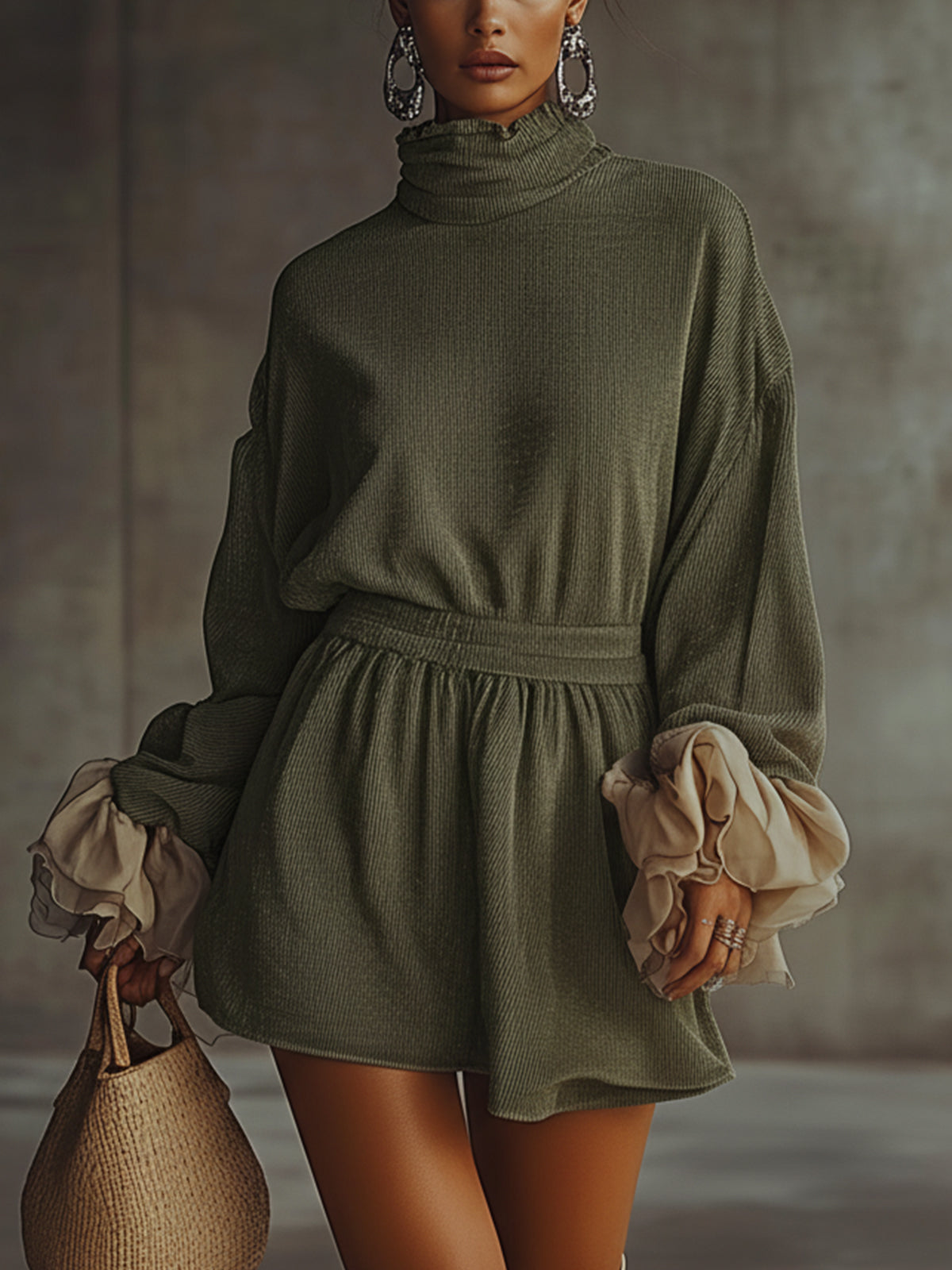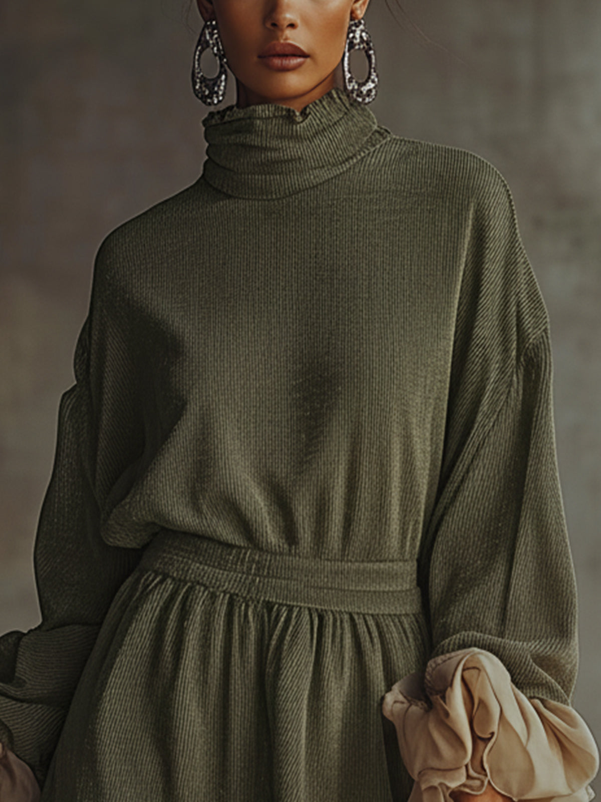 This green dress combines understated elegance with comfort, highlighted by its flowy chiffon cuff design that adds a touch of whimsy. The high turtleneck enhances the cozy aspect, making it a perfect choice for cooler days.