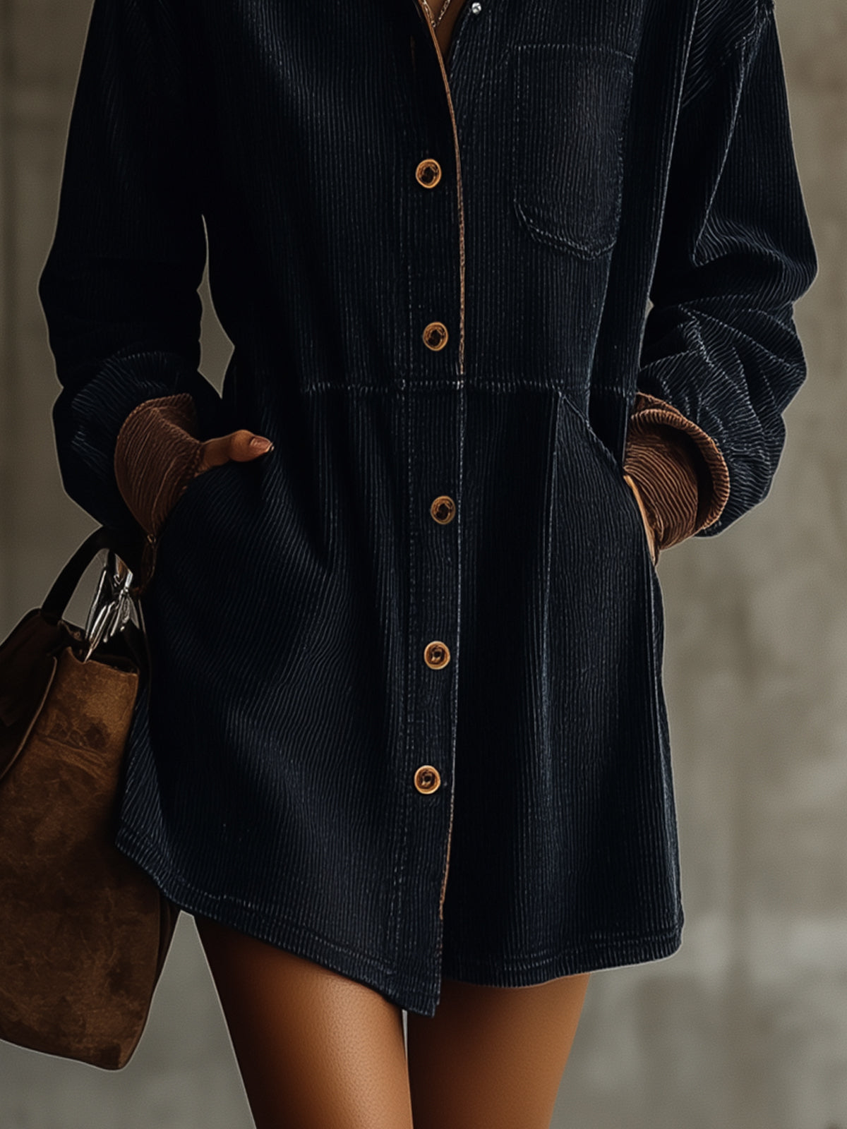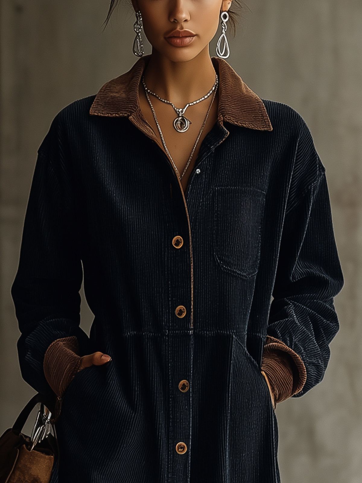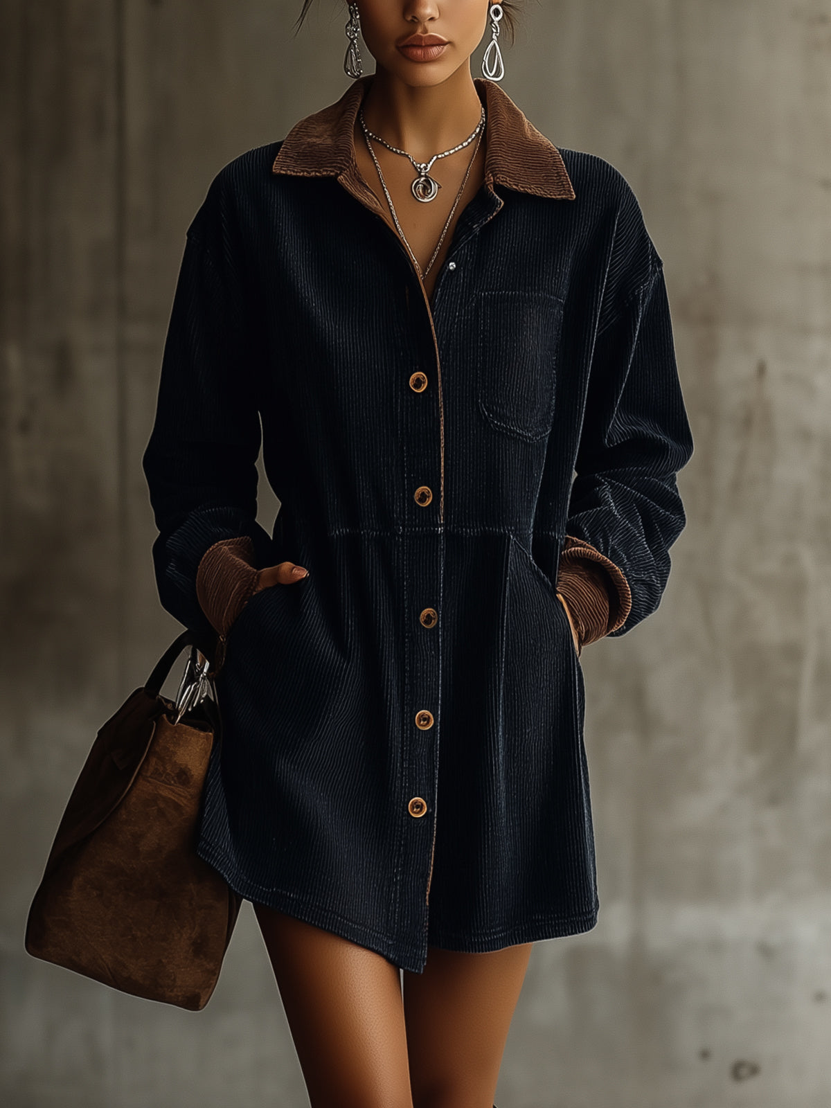 This navy corduroy shirt dress is a versatile staple, designed with a touch of contrast for added flair. The button-down front and relaxed fit make it a practical yet stylish choice for everyday wear.