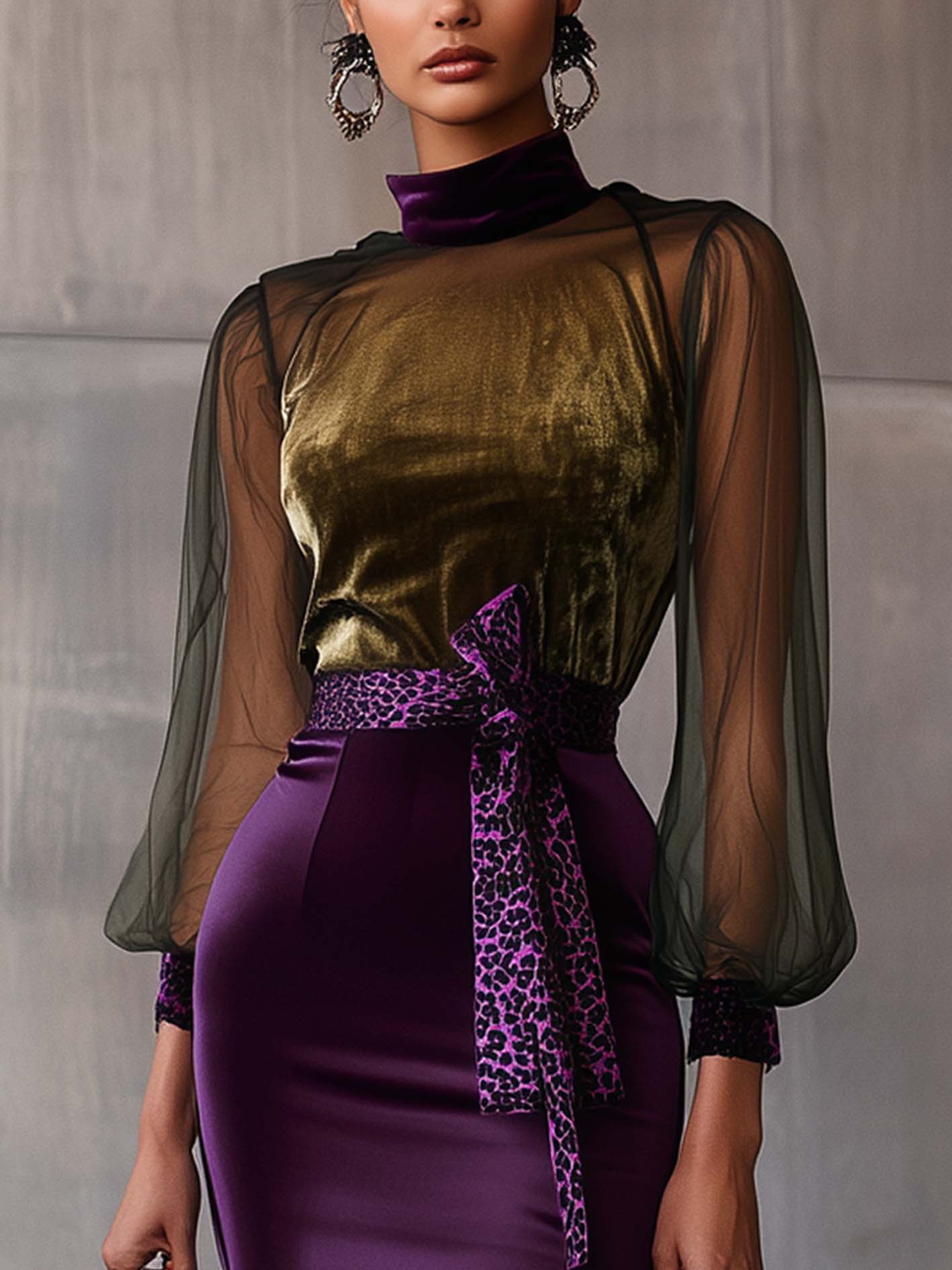 This purple velvet bodycon dress stands out with its unique color-blocking of lush purple and deep green, paired with sheer mesh sleeves that add depth and refinement. The dress combines boldness with elegance, offering a striking style that makes it perfect for standout evening wear. The belt with animal print detailing adds a contemporary and playful touch, balancing the opulence of the velvet fabric.