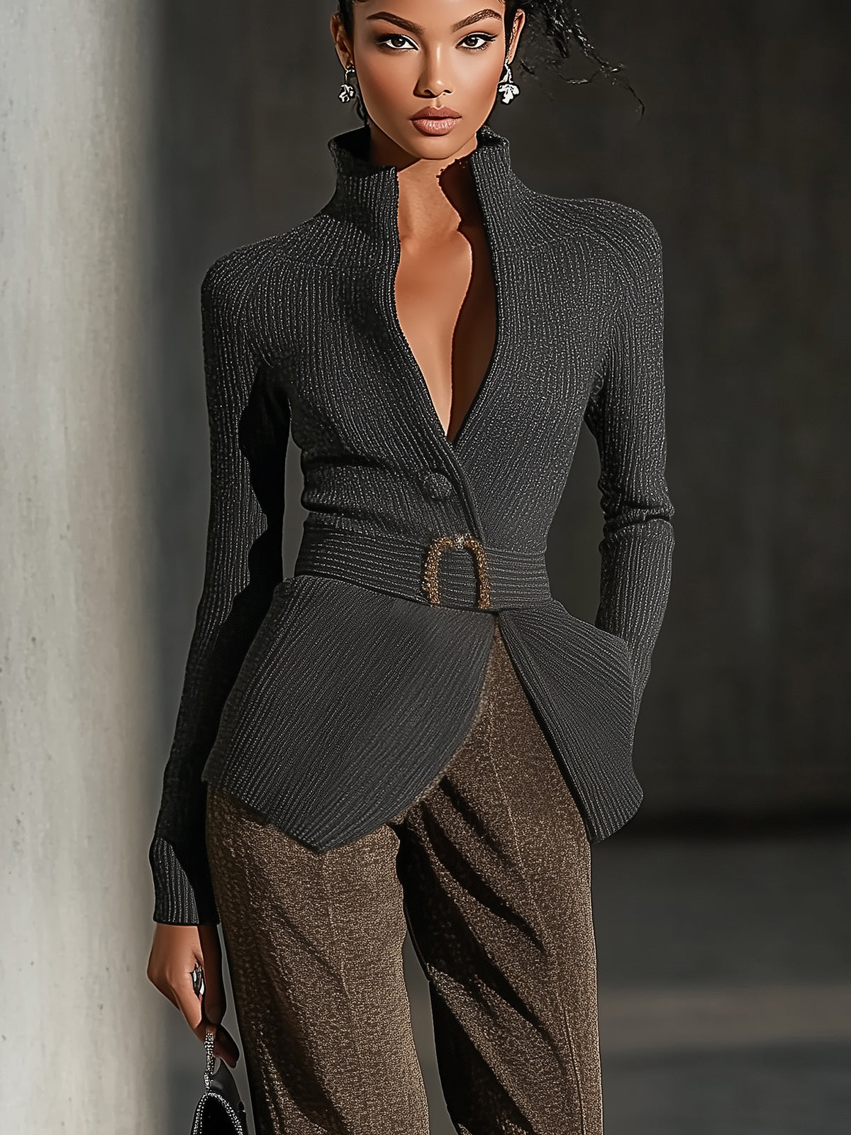 This black ribbed high neck belted knit jacket combines elegance with a contemporary edge. The fitted design and statement buckle create a chic and commanding presence.