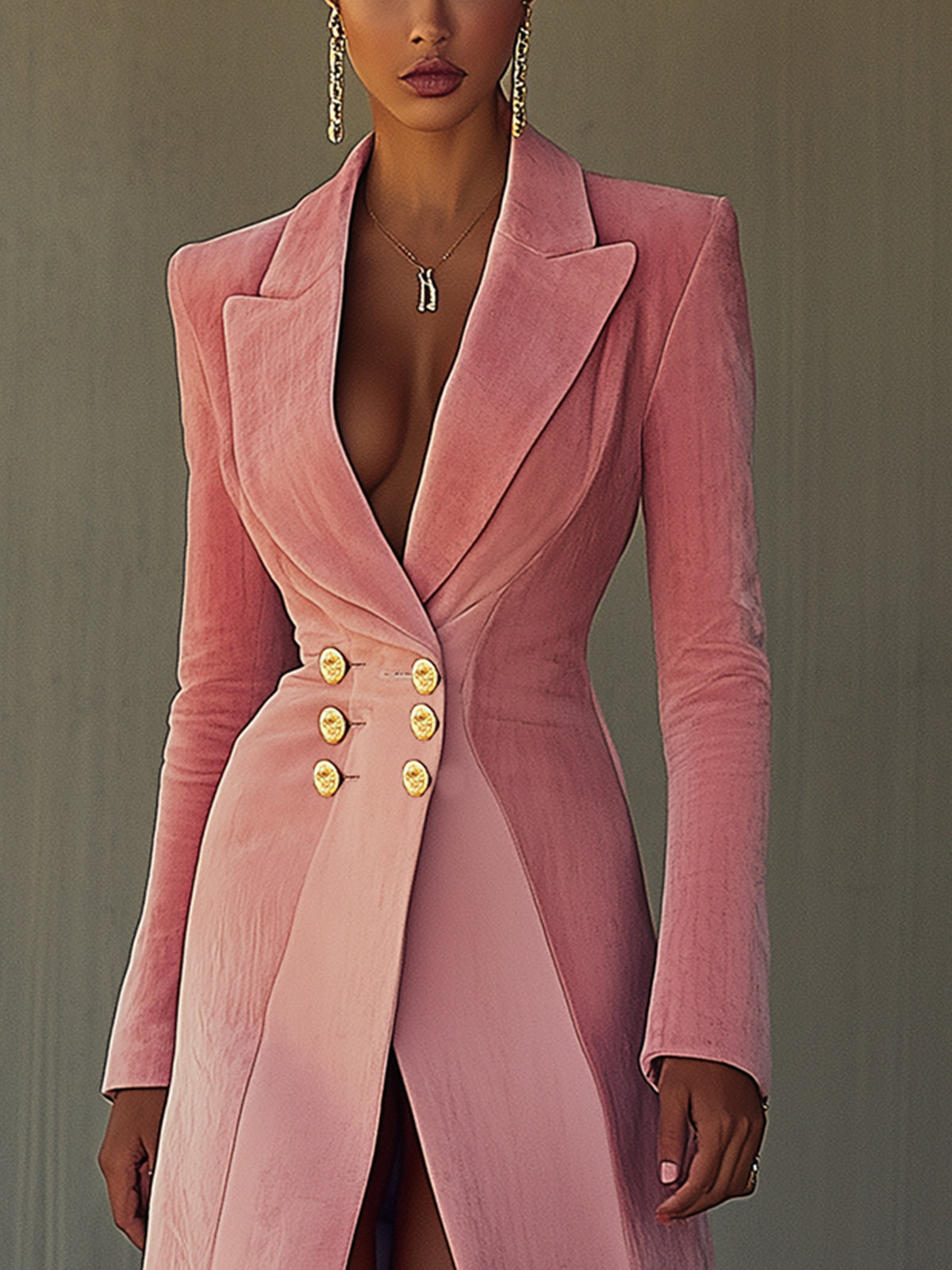 This blush pink velvet blazer dress merges classic tailoring with contemporary allure. The rich texture and striking design elements create a statement piece perfect for making an entrance.
