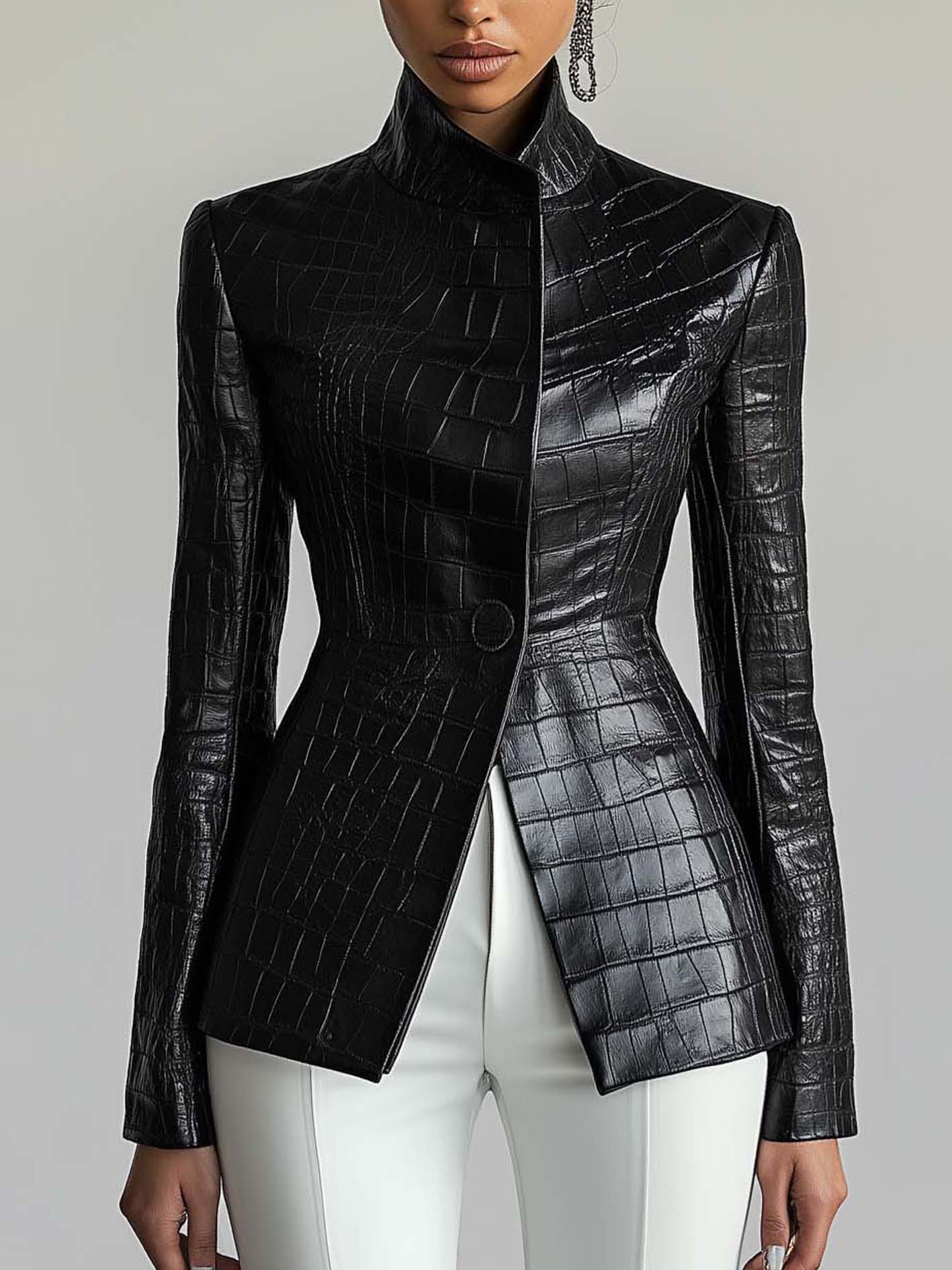 Design: This striking piece features a tailored silhouette with a small stand-up collar, clean structured lines, and a front button closure. The crocodile pattern enhances the sleek black finish, while the sharp edges and precision-cut seams elevate the jacket’s overall polish.