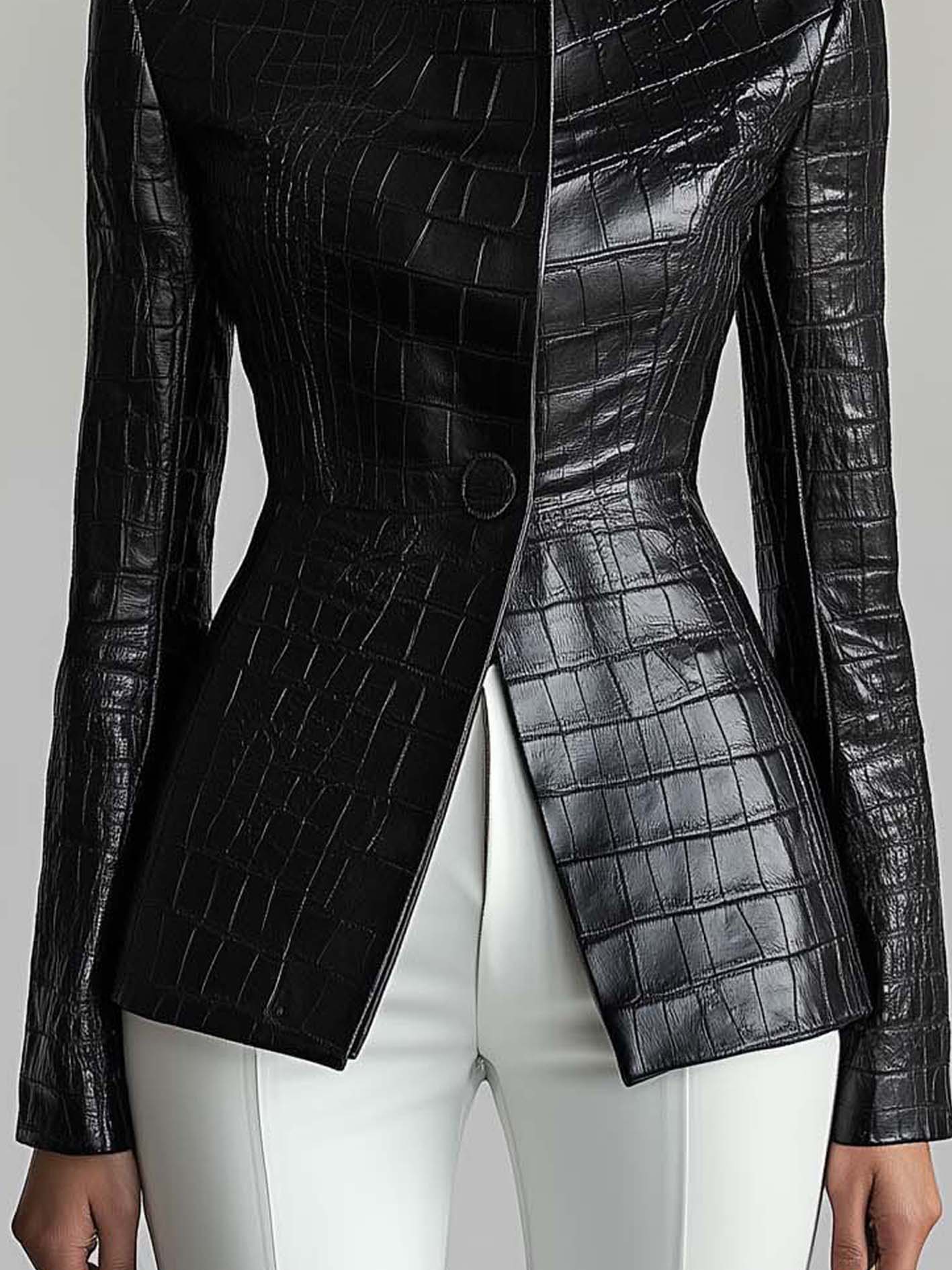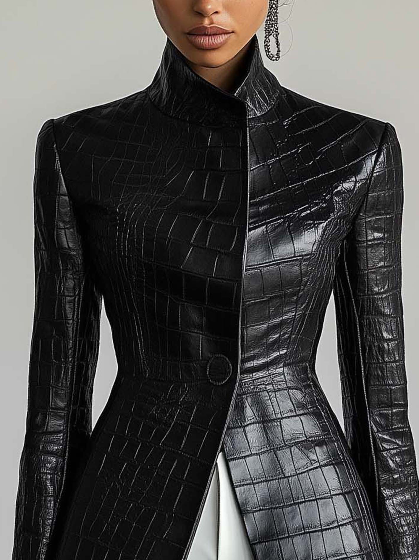 This all-black faux leather jacket combines architectural design with a rich crocodile-embossed texture, creating a powerful and luxurious garment. The defining small stand-up collar, single-button closure, and tapered waist give this piece a militaristic sharpness, yet its glossy surface and flowing flare ensure femininity is maintained. The jacket’s commanding silhouette and exceptional detailing position it as a high-impact statement piece for any style-conscious wardrobe.A true fusion of modern elegance and bold presence, this jacket is the perfect choice for those who want to stand out through texture, tailoring, and timeless black. Whether styled monochromatically or contrasted with lighter bottoms, its structured form and sleek sheen deliver head-turning sophistication and edge.