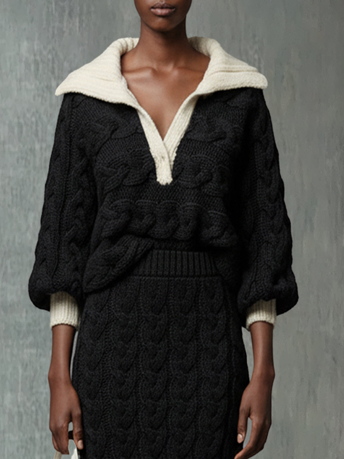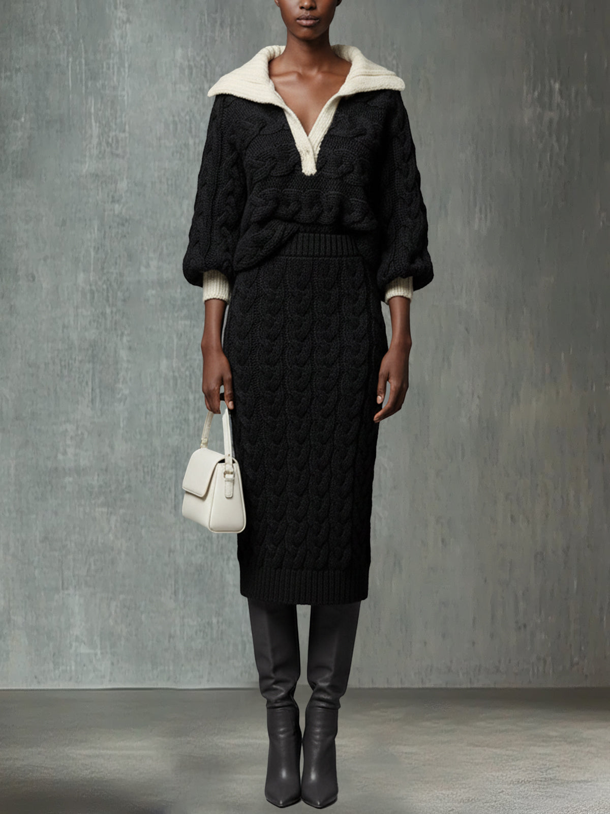 2. Design: The outfit features a classic black cable knit design, paired with a contrasting cream collar for a pop of visual interest. The skirt's midi length and ribbed hem provide a balanced silhouette.