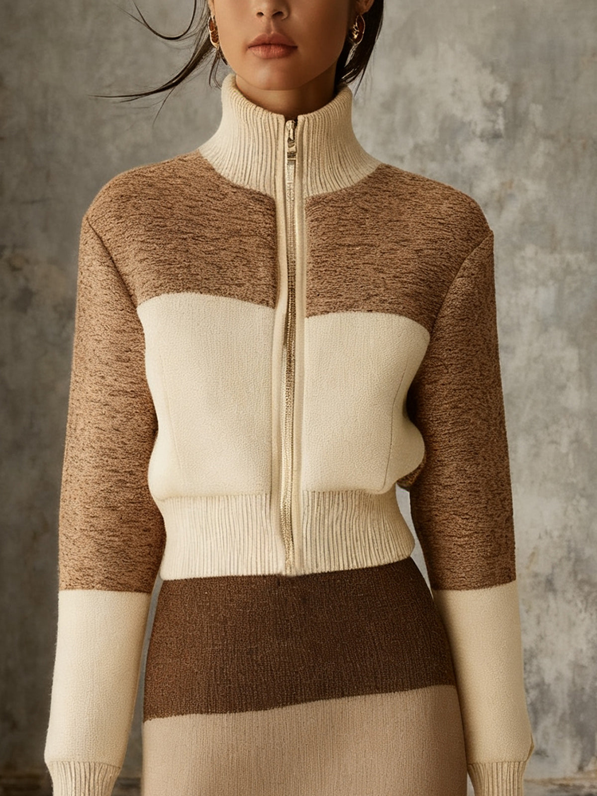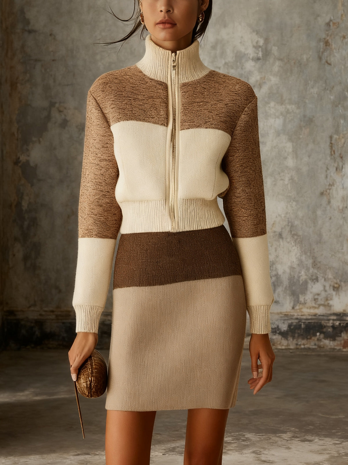 Design: High-neck zip-up sweater and matching skirt featuring a striking color-block pattern in warm neutral tones.