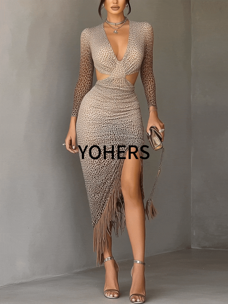 This sultry leopard-print dress blends wild elegance with contemporary edge. The twist-front design adds a sculptural effect, while the waistline cutouts and thigh-high slit bring out a daring femininity. The fringe hem adds an unexpected bohemian twist, creating graceful movement with every step.