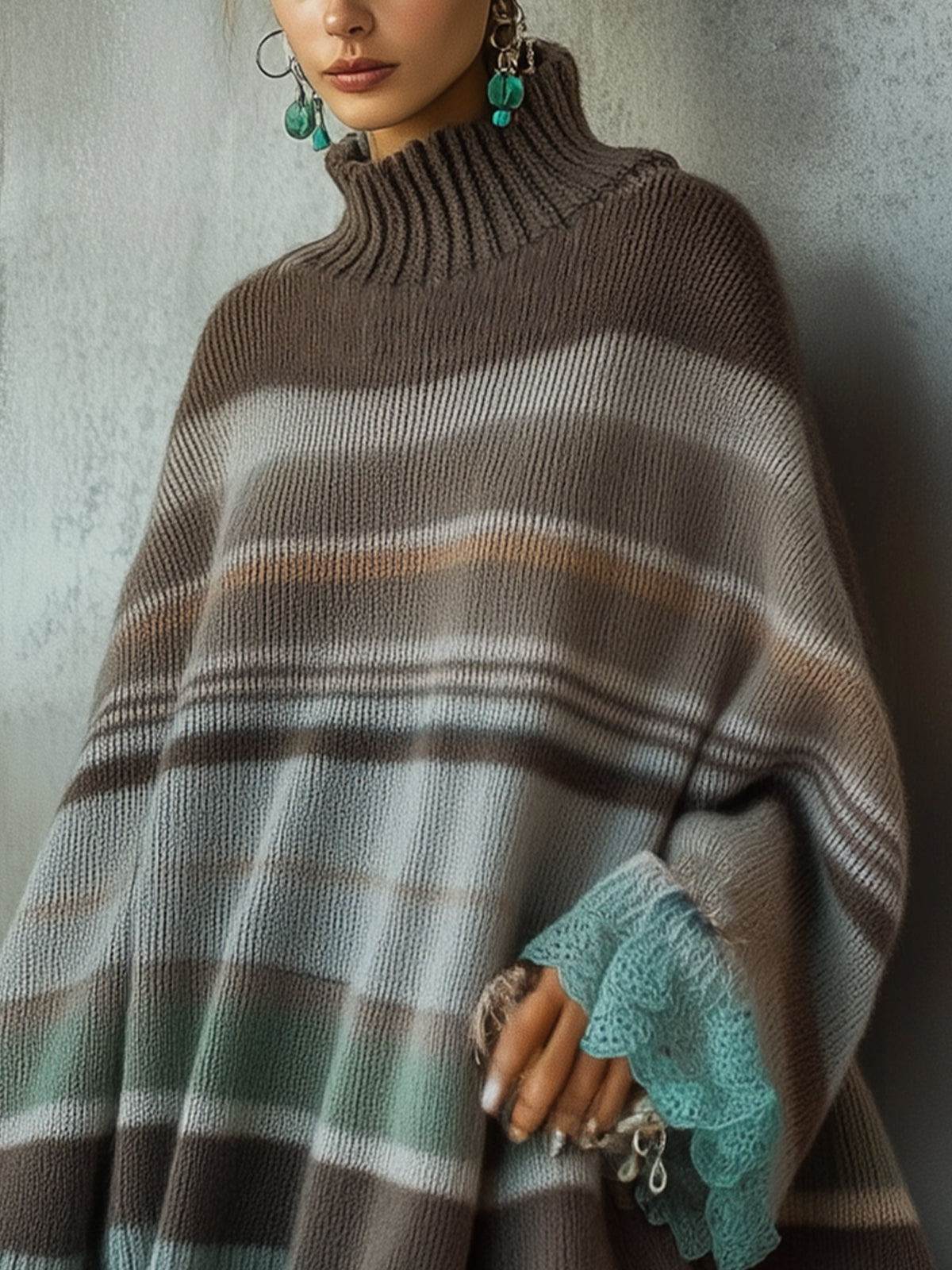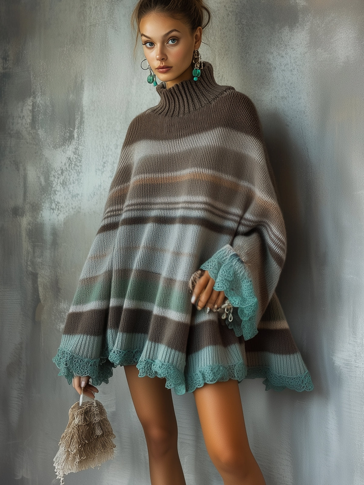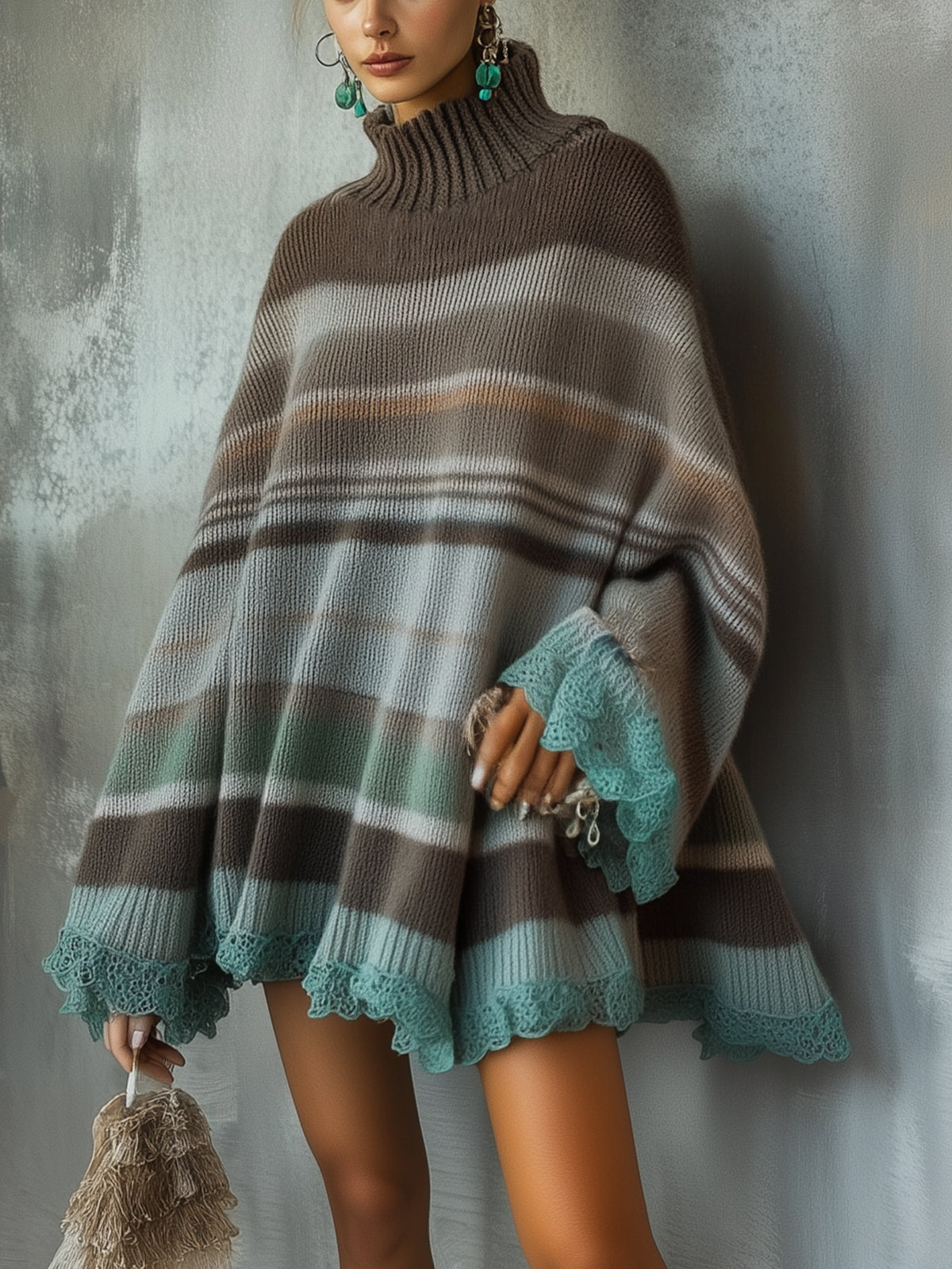 Striped Brown And Teal Knit Sweater Dress With Lace Trim