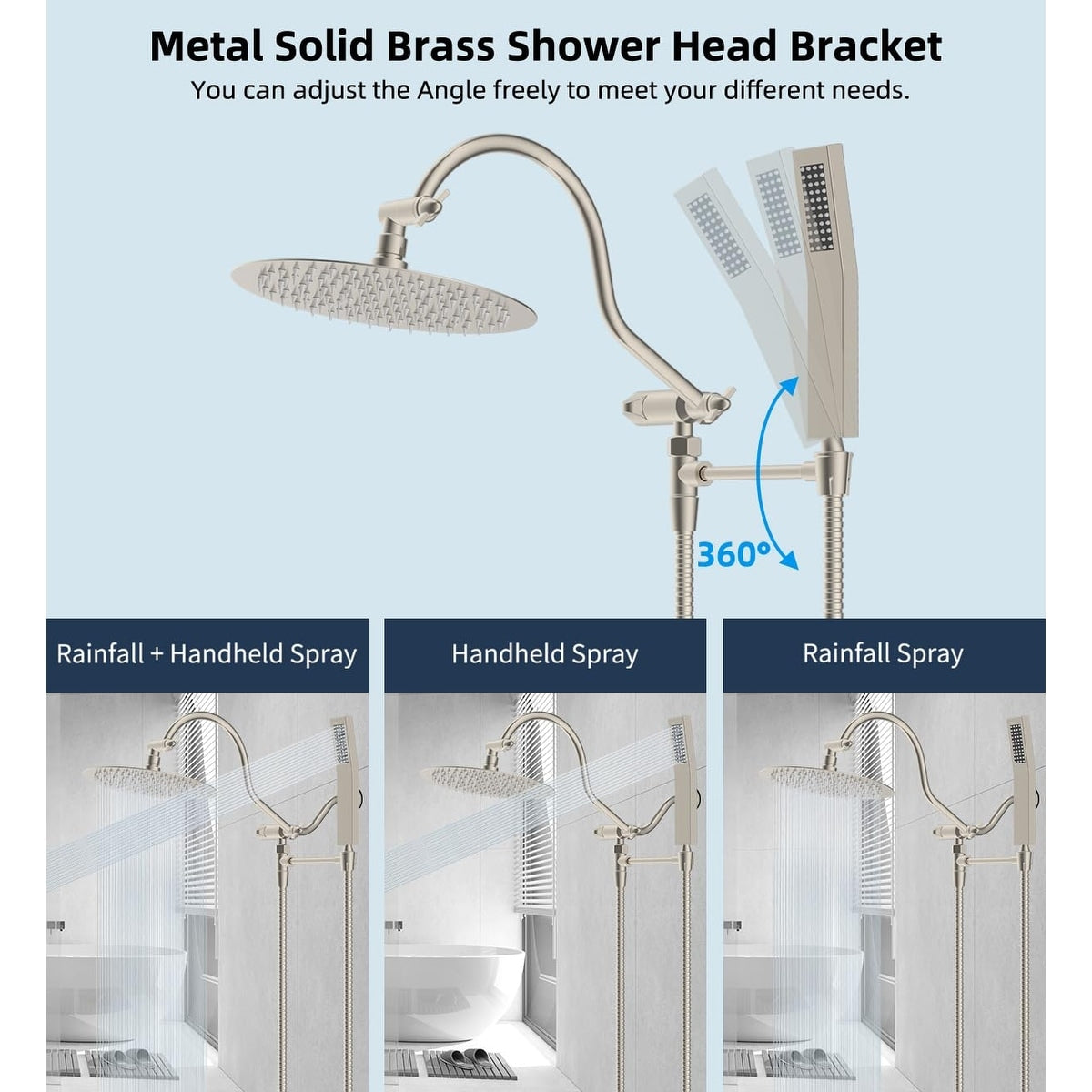 • Metal Shower Head Bracket & Shower Wand: Compared to a typical shower head bracket, the bracket is longer and prevents the handheld spray from hitting the back of the rain shower head. Other shower head comes with shorter brackets, and the handheld spray will hit the back of the rain shower head. The shower head and shower head bracket are made of stainless steel and other metal that resist corrosion, and are rust-proof. The shower head holder perfectly adjusts the angle of your shower head.