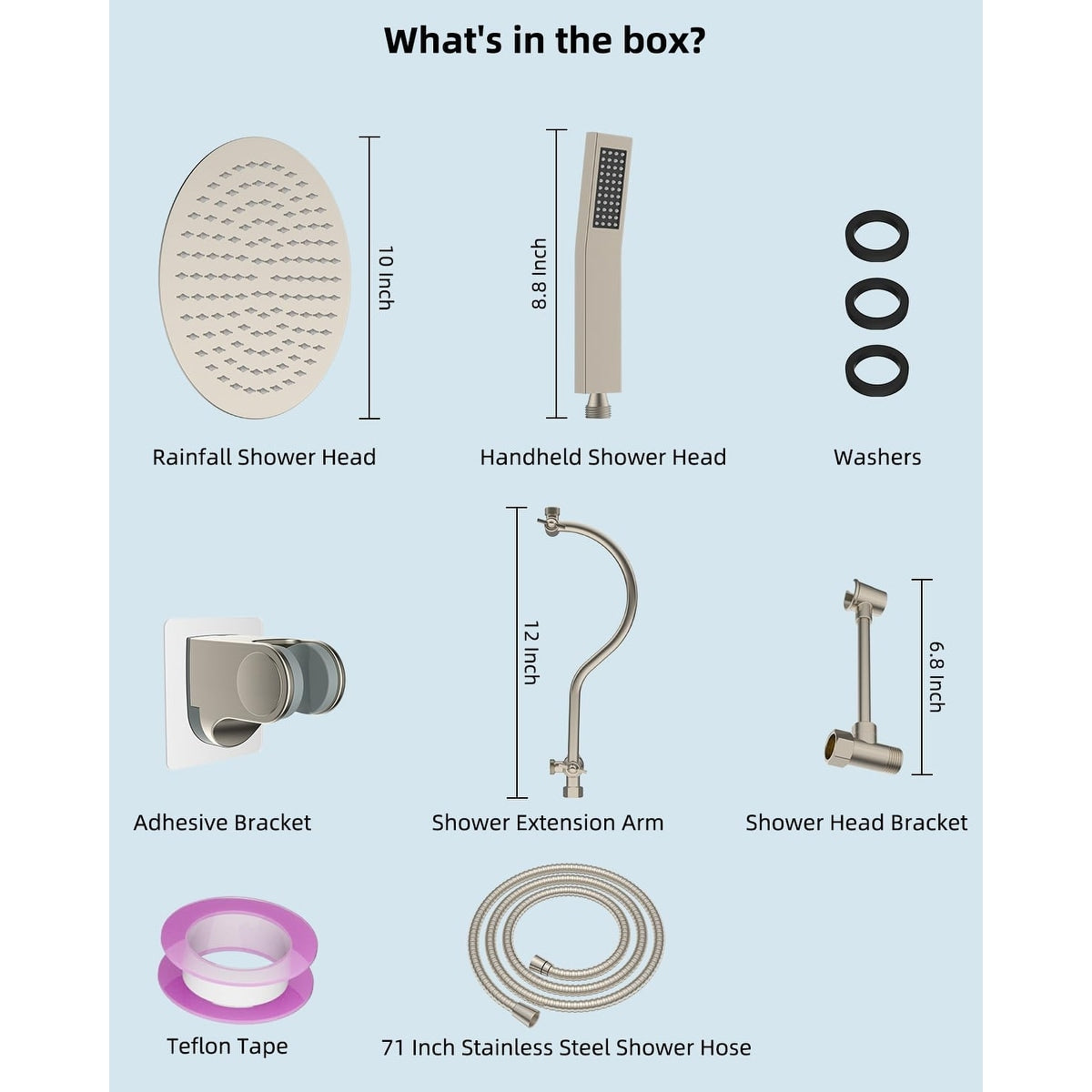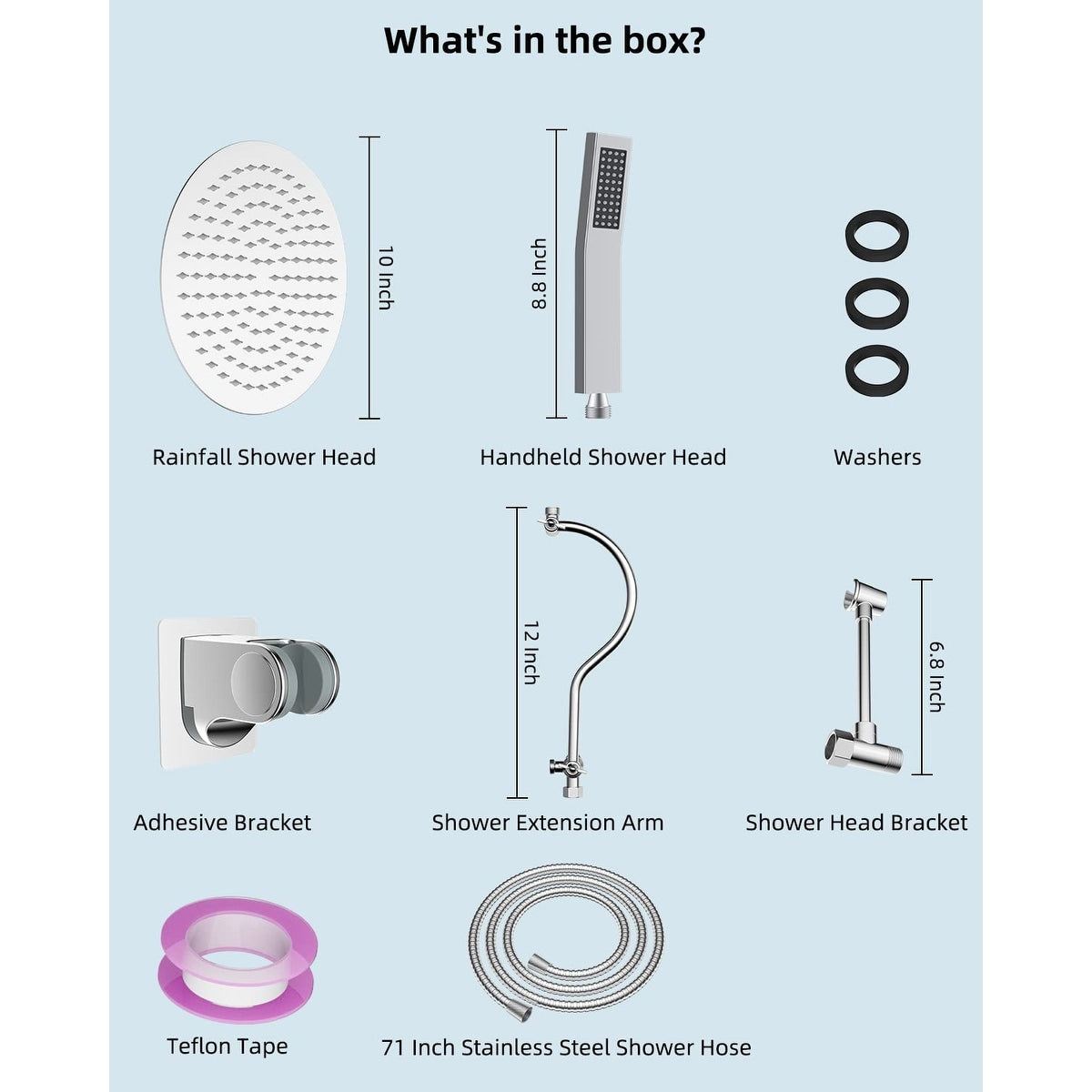 • Shower Head Combo: This shower combination comes with a 10-inch large round rain shower head, handheld shower head, 71-inch metal stainless steel shower hose, 12-inch shower head extension arm, adhesive shower head holder, shower head bracket, washers, Teflon tape, and installation manual. All metal stainless steel and solid metal extra long 71-inch shower hose is made of odorless EPDM material that can be used in a high-pressure and high-temperature environment.