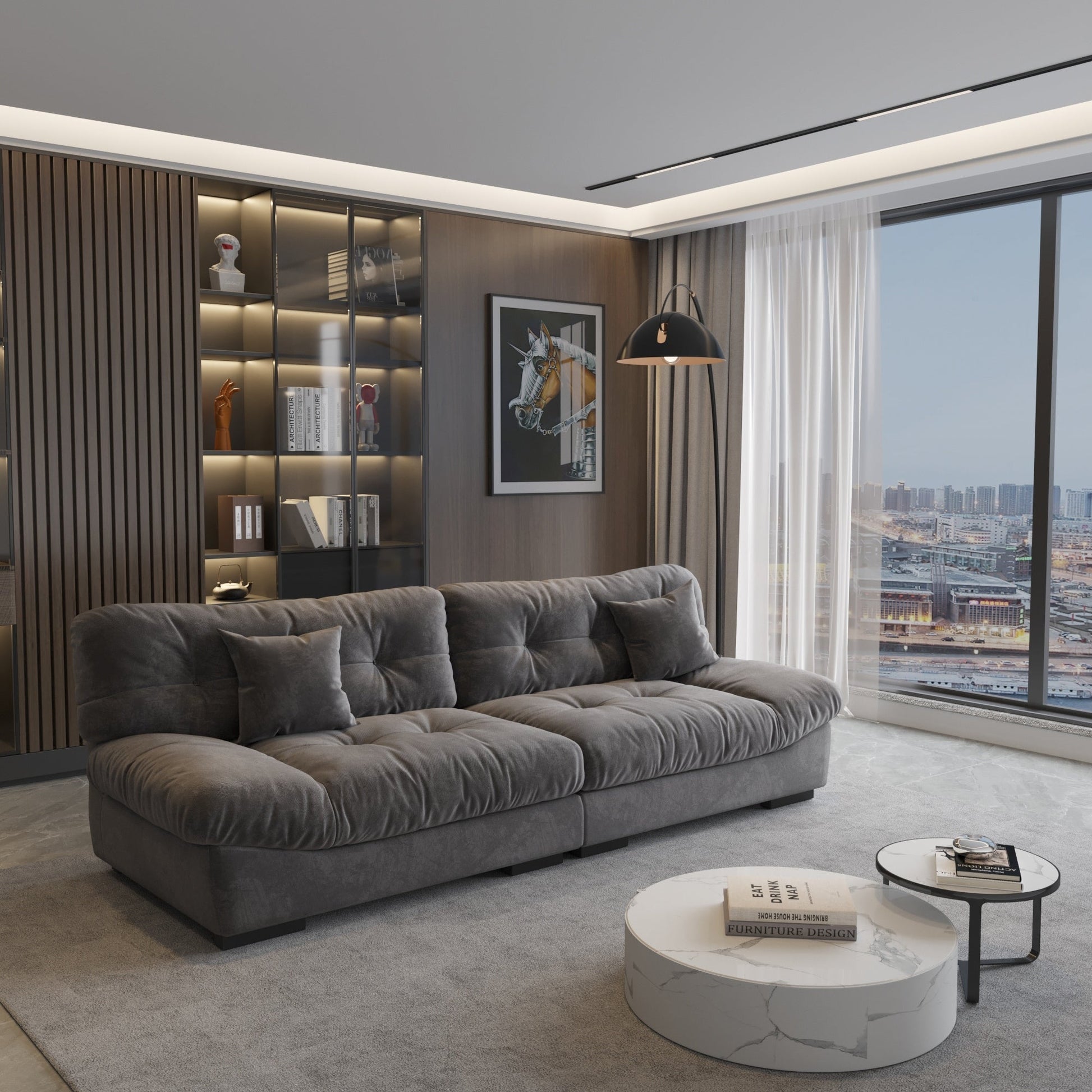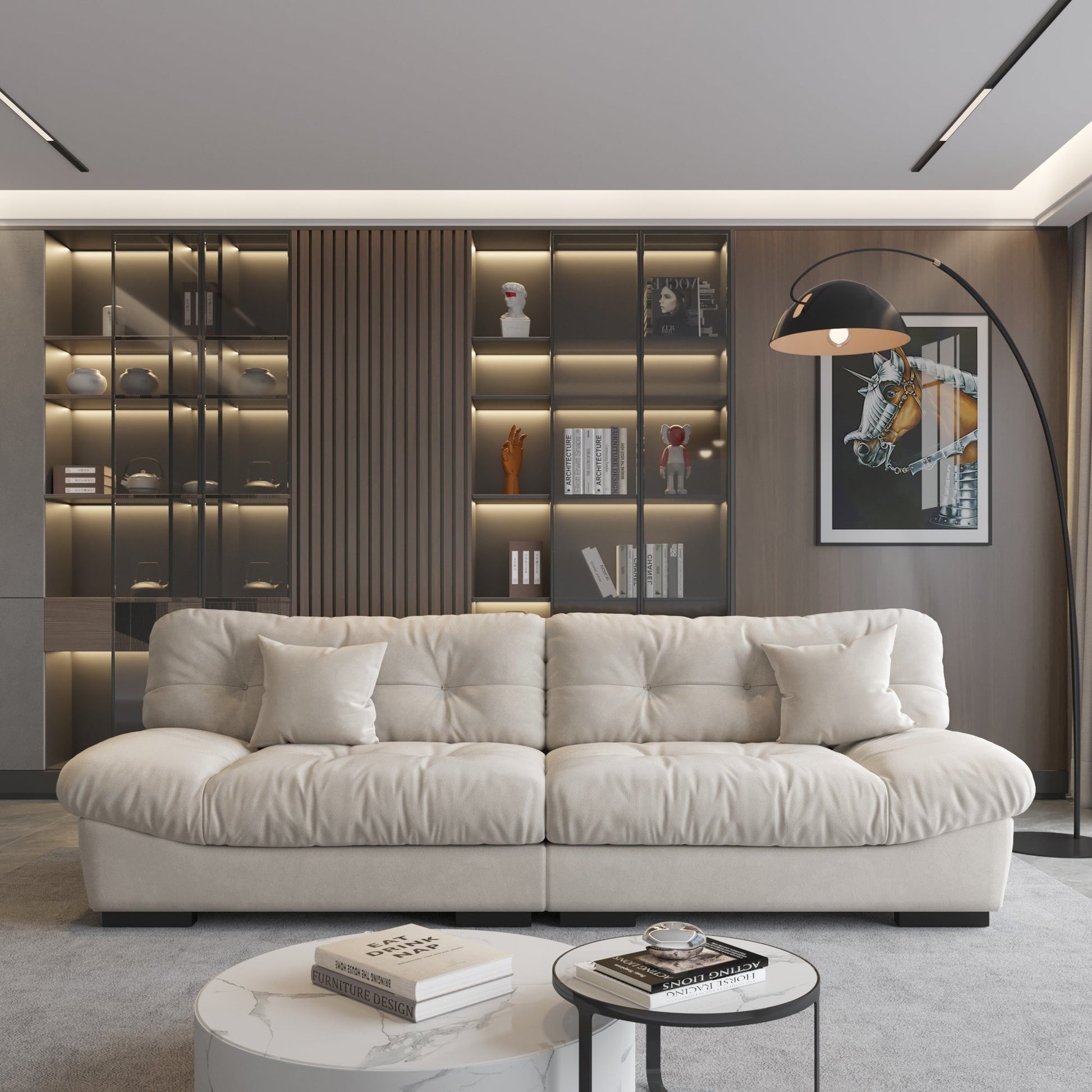 The epitome of comfort and luxury for your living space! This designer sofa is not just any ordinary couch - it's a haven of relaxation that will elevate your lounging experience to new heights. With its deep, plush seats and supportive backrests, the Cloud Sofa is designed to provide unparalleled comfort for you and your loved ones.Measuring 8.75 feet in length, this couch is spacious enough to comfortably seat three people, making it the perfect centerpiece for your living room or entertainment area. But the Cloud Sofa is not just for sitting - it's so comfortable that it can double as a bed! Whether you want to take a quick nap or have an overnight guest, this sofa easily transforms into a cozy sleeping space.