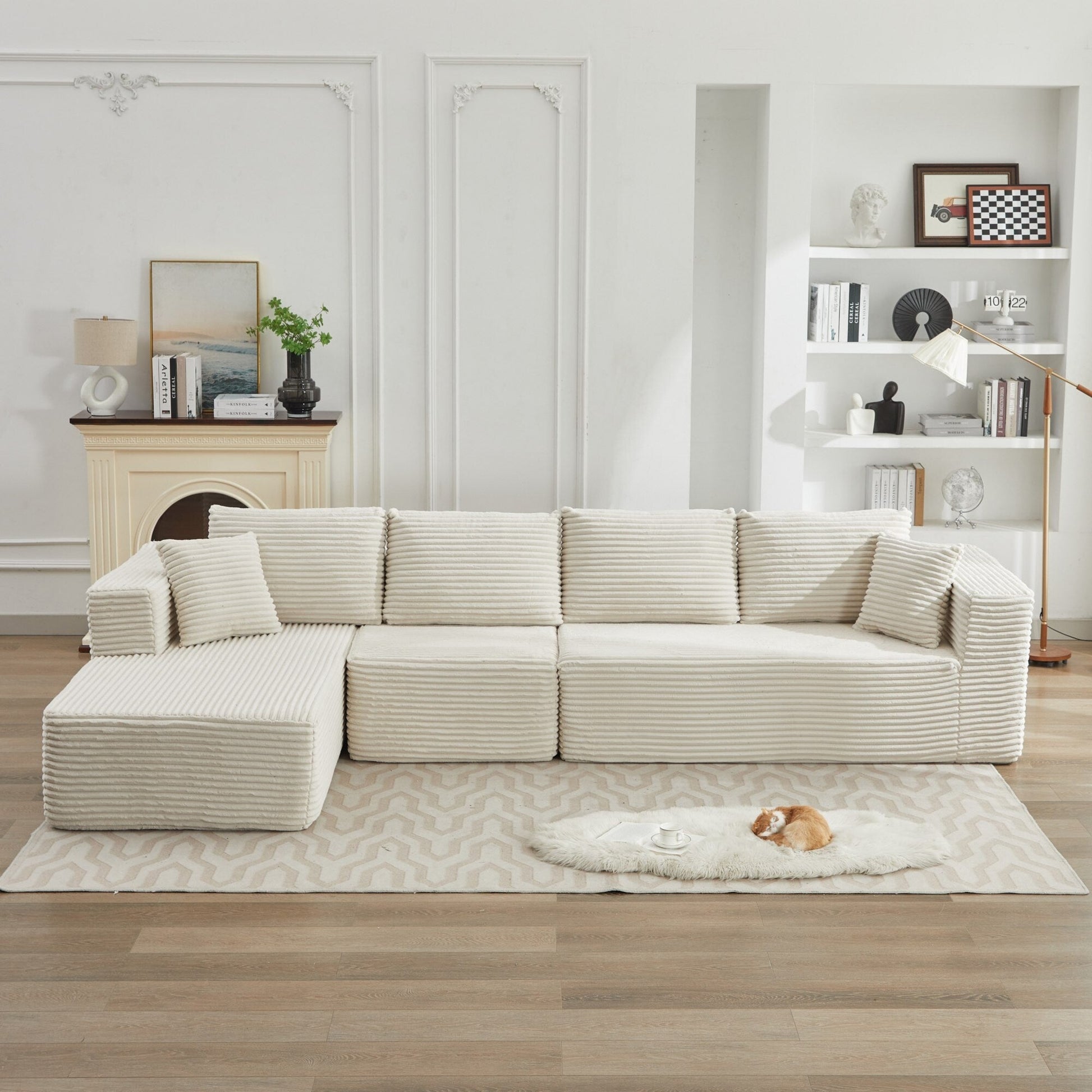 Modular Sectional Sofa: This L-shaped sectional sofa is all about versatility. It’s designed to be super flexible, so you can change it up to fit your space perfectly. This minimalist l shaped couch maximizes space when placed against a wall. Composed of two chic pieces, this living room set invites you to customize your comfort and style