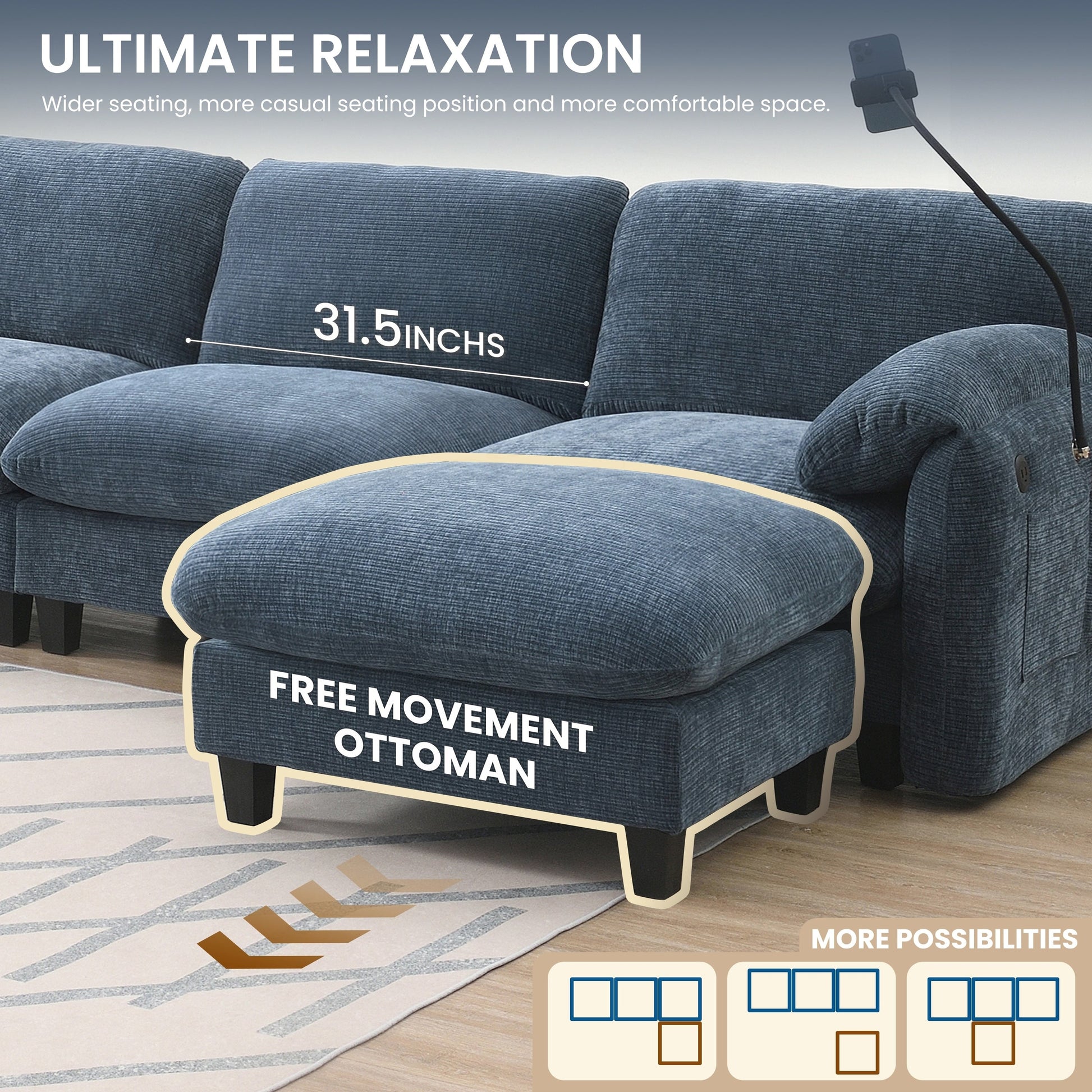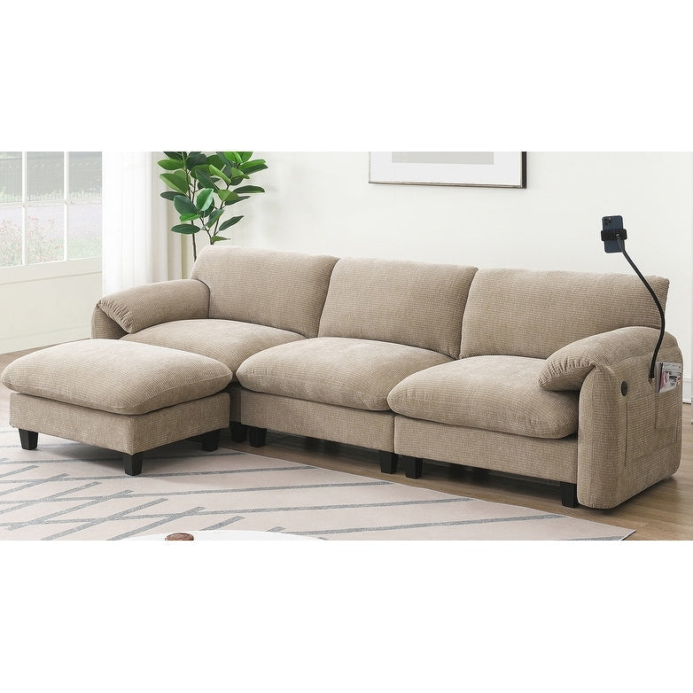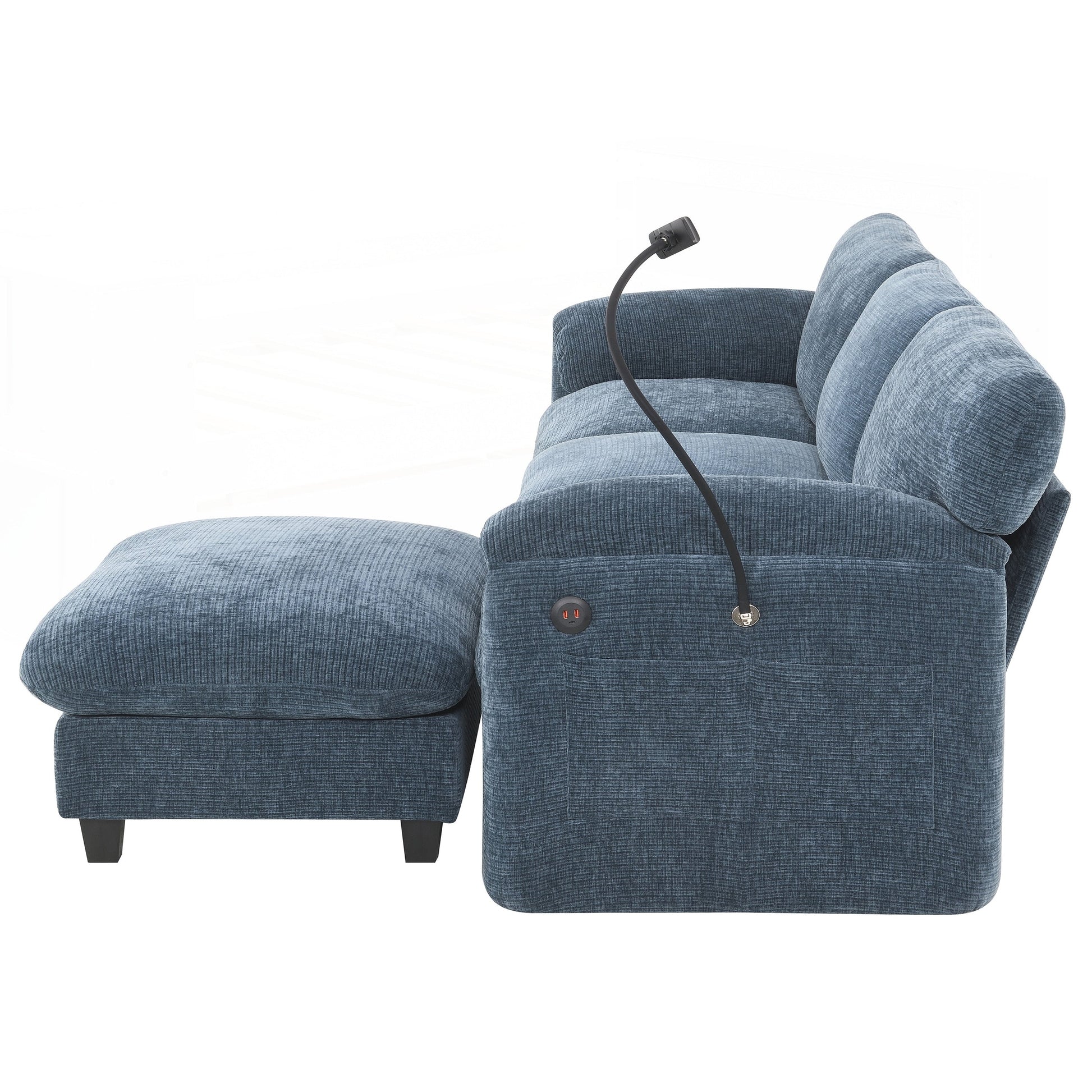 Side Storage Pockets、USB Charger and phone cradleï¼?Designed with storage pockets on both sides, this sofa makes it easy to keep essential items like books, magazines, or remote controls within reach. USB Charger and phone cradle are practical for everyday use, helping to reduce clutter and make your living space more organized. Convenient Armrests: Having armrest pillows on both sides of the sofa provides extra support and comfort for your arms and shoulders. They offer a place to rest your arms while sitting, making it easier to maintain a relaxed posture. Movable Ottomanï¼?The sofa comes with a removable ottoman, which can be repositioned as needed. Whether used as extra seating, a footrest, or a coffee table, the ottoman adds versatility to the layout. You can move it to any part of the room to suit your seating preferences or change the arrangement to suit different