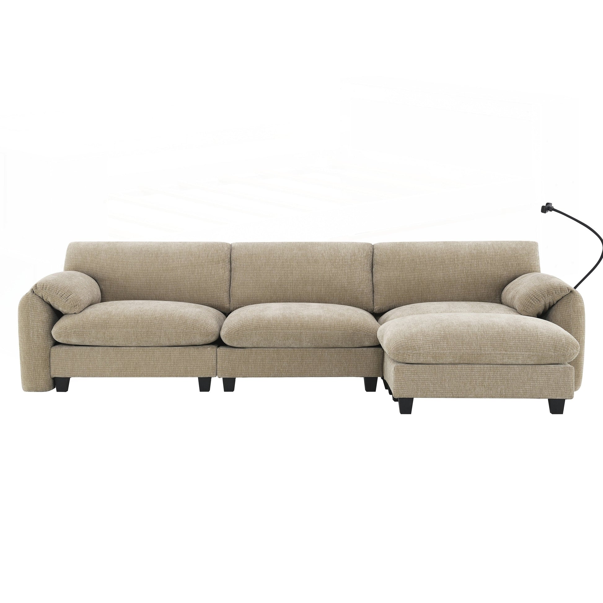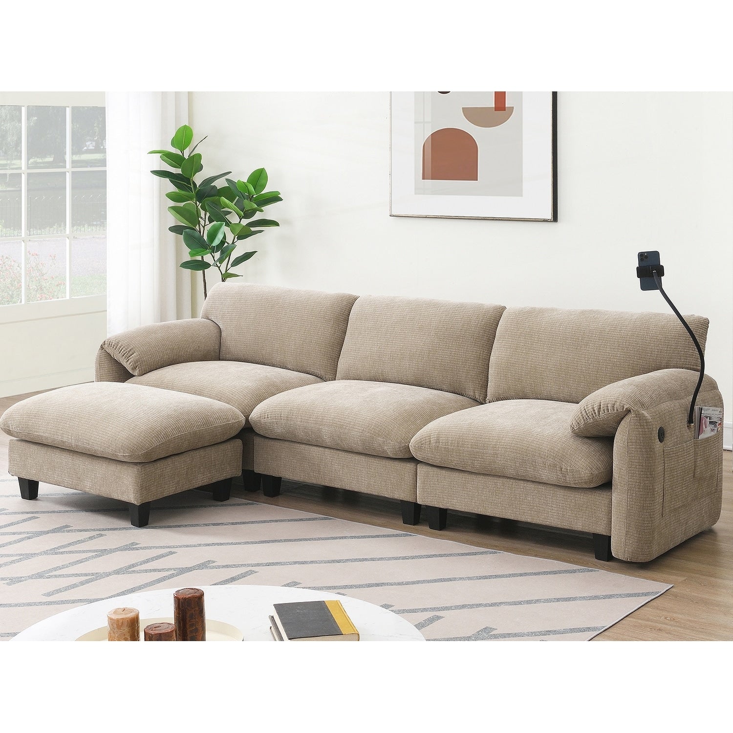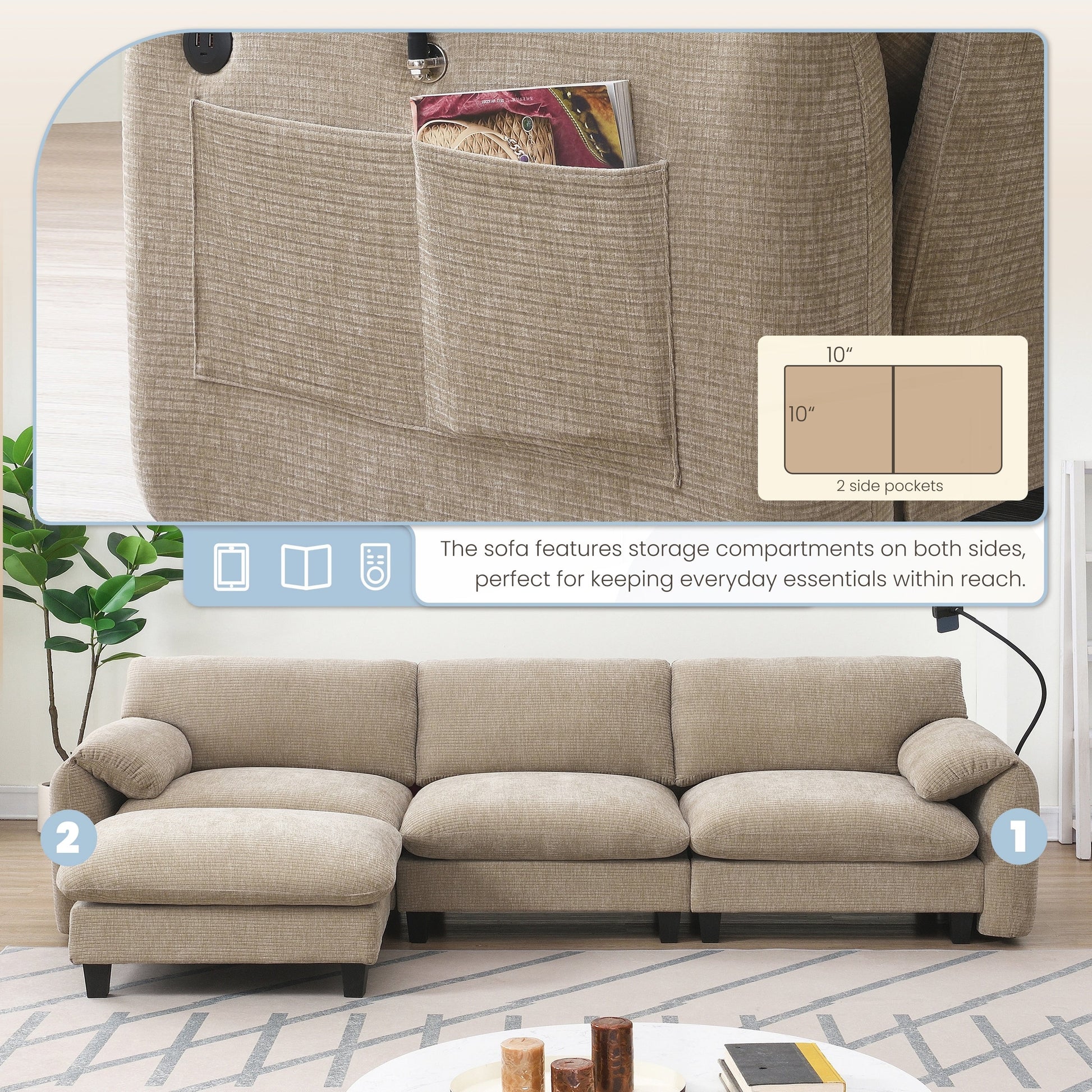 Side Storage Pockets、USB Charger and phone cradleï¼?Designed with storage pockets on both sides, this sofa makes it easy to keep essential items like books, magazines, or remote controls within reach. USB Charger and phone cradle are practical for everyday use, helping to reduce clutter and make your living space more organized. Convenient Armrests: Having armrest pillows on both sides of the sofa provides extra support and comfort for your arms and shoulders. They offer a place to rest your arms while sitting, making it easier to maintain a relaxed posture. Movable Ottomanï¼?The sofa comes with a removable ottoman, which can be repositioned as needed. Whether used as extra seating, a footrest, or a coffee table, the ottoman adds versatility to the layout. You can move it to any part of the room to suit your seating preferences or change the arrangement to suit different