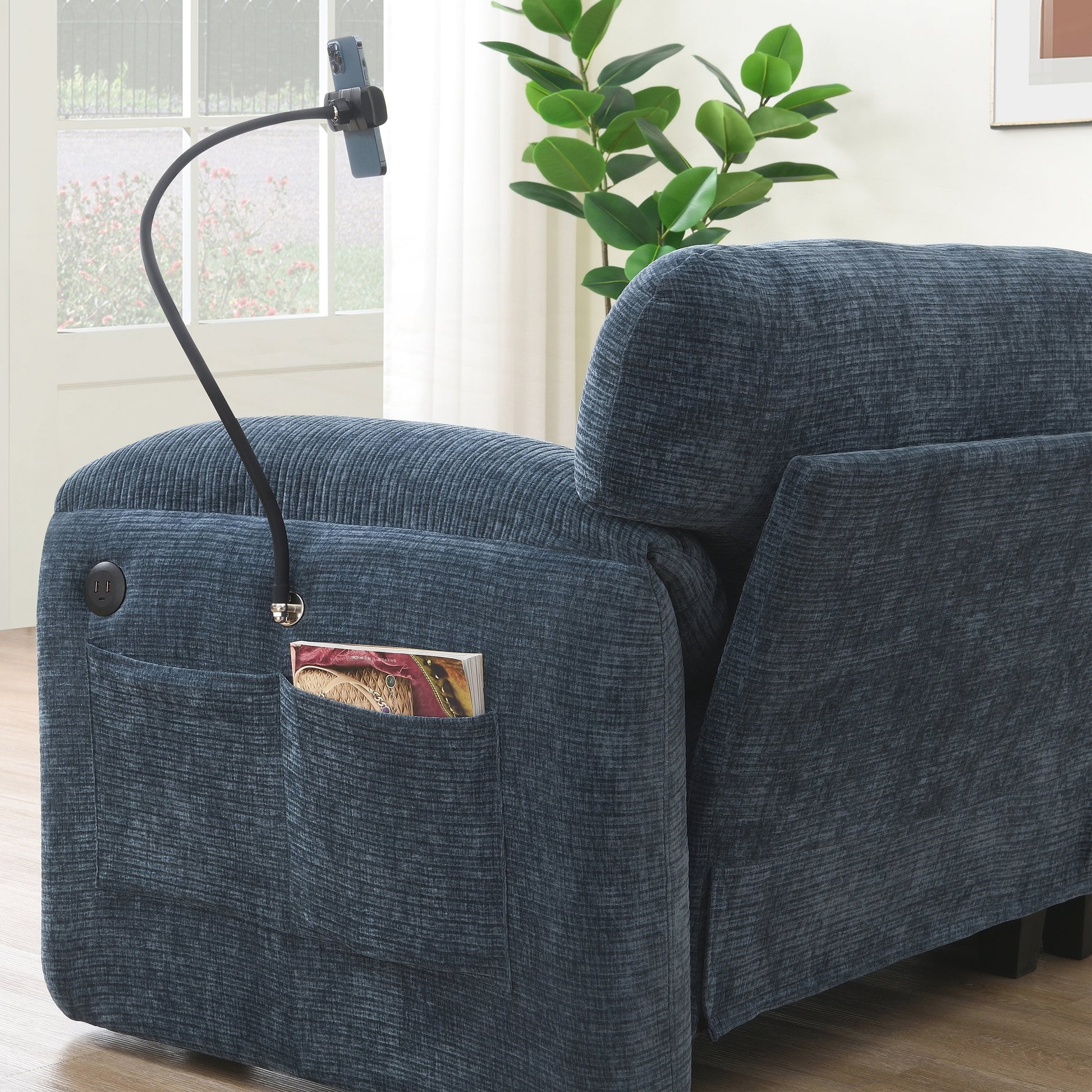 Phone Holder and Charger: The phone holder secures devices to prevent slipping into sofa gaps, and there is no need for separate holders. Armrest placement follows body mechanics. The chargers are built-in ports, which eliminate power strips and your battery anxiety.