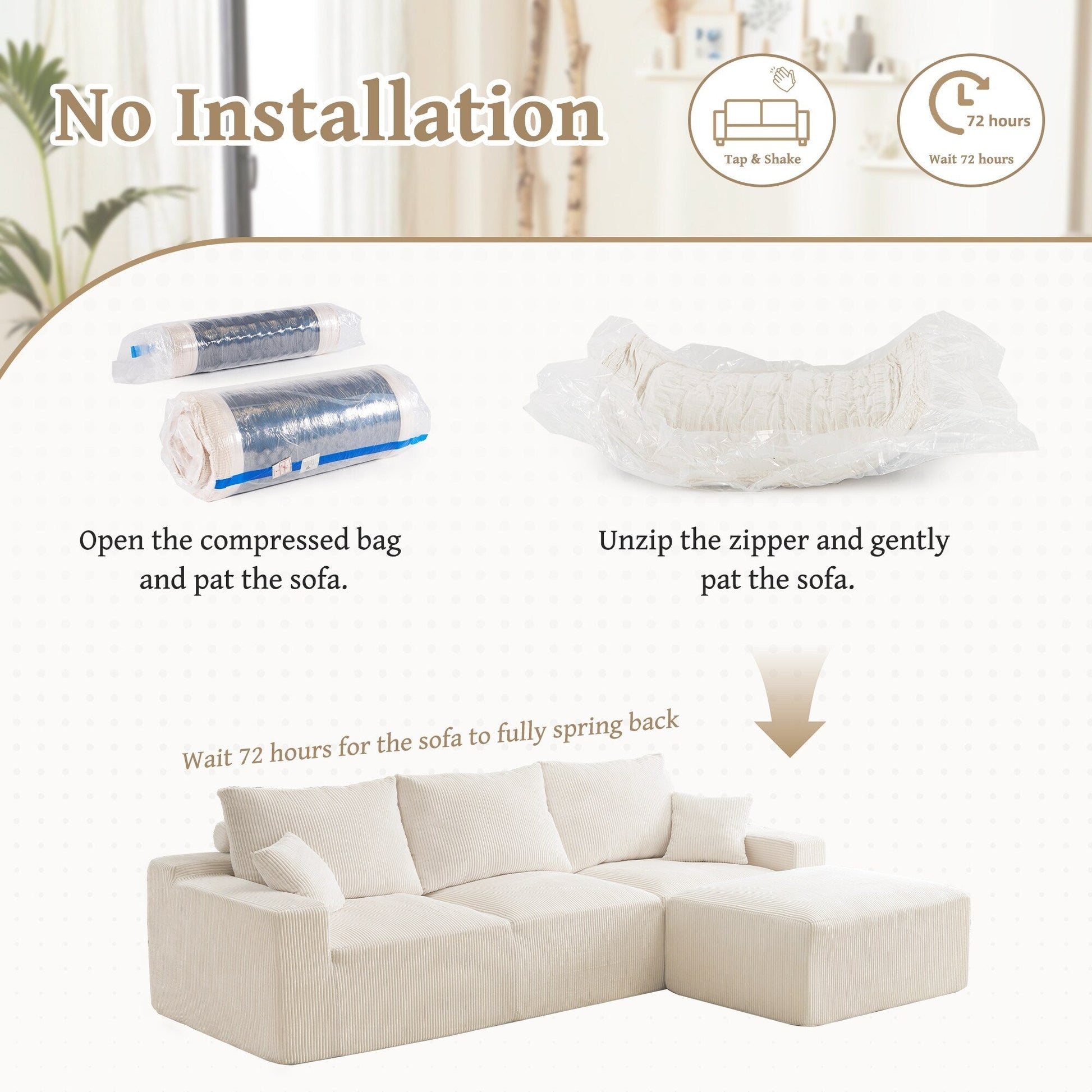 Specification Product Information Product Type:Combo Item Product Name: '110' L-Shaped Sectional Sofa, Full-Compression 3-Seater Cloud Couch with Chaise, No Assembly Required Sofa for Living Room, Ultra-Soft Deep Seat Modular Sofa Main Material:Corduroy Seats:3 Seat Product Dimensions Assembled Length (in.):110.00 Assembled Width (in.):82.00 Assembled Height (in.):24.00 Product Weight (lbs.):184.80 Package Size Package Quantity: 1 45.28 * 20.08 * 20.08 in. 140 lbs. Package Quantity: 2 35.83 * 10.63 * 10.63 in. 31 lbs. Product Features ãFull-Compression Technology - Self-Expanding Designã?/strong>Ships compressed (60% size reduction) for easy delivery. Allow 72 hours to 1 week after unboxing for cushions to fully expand and restore their cloud-like loftiness. ãNo Assembly - Ready to Useã?/strong>100% pre-assembled - Unlike traditional sofas, just unbox and let it expand. Watch it transform to perfect shape with zero tools or hassle! ãLuxurious Slow-Recovery Foamã?/strong>Premium high-resilience foam - Gradually regains original shape for long-lasting support and exceptional comfort. The longer it expands, the plusher it feels! ãModular L/U-Shape Configurationã?/strong>Customizable with ottomans - The 3-seater main sofa pairs with 1 or 2 or 3 ottomans (additional ottoman sold separately) to create L-shape or U-shape layouts. Perfect for apartments, living rooms or home theaters! ãPlush Corduroy Upholsteryã?/strong>Ultra-soft touch - Premium corduroy fabric provides warm, skin-friendly comfort that elevates your living space. Easy to clean and maintain. ãUpgraded Back Supportã?/strong>Enhanced with cylindrical neck pillows - The added bolster cushion provides optimal lumbar/neck support when reclining, significantly improving comfort.