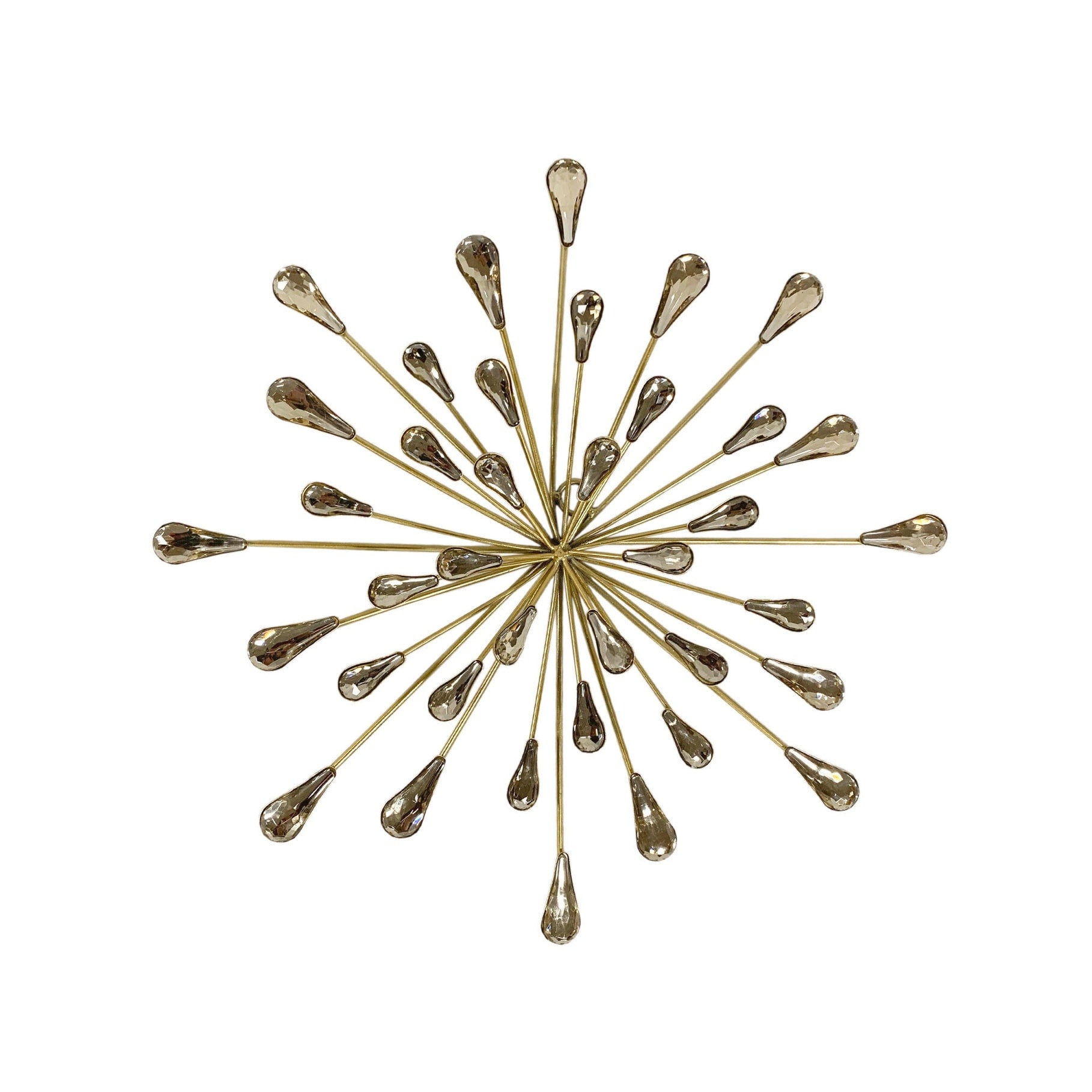 Add a touch of elegance to your wall with our Medium Gold Starburst Wall Art. With its gold painted metal and gold acrylic beads, this piece is the perfect accent to any room. At just under 2 inches deep, it won't take up too much space on your wall. Create a unique and stylish wall scape by hanging multiples.