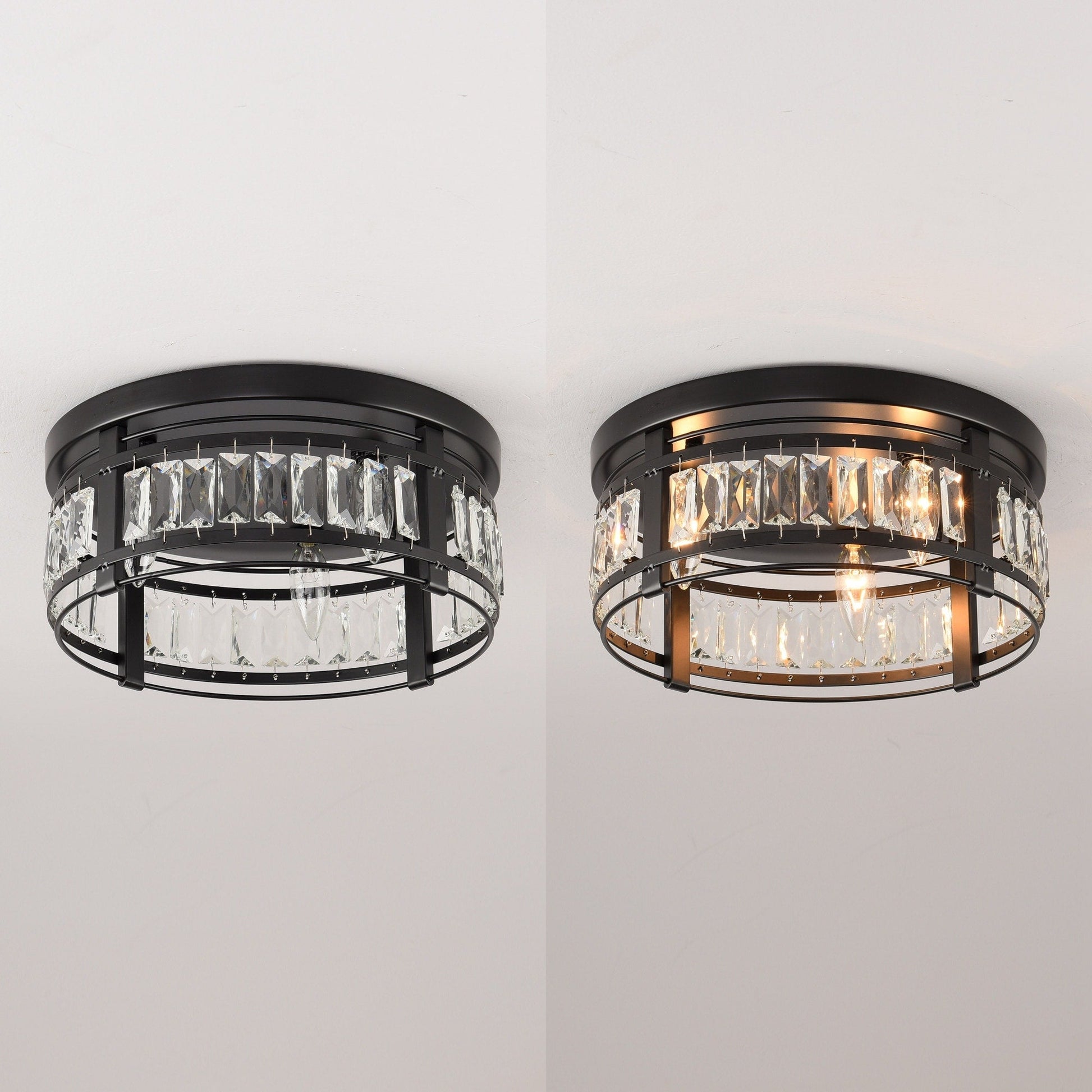 Adorned with glittering crystal accents, this modern flush mount ceiling light is guaranteed to provide a dazzling accent. The crystal ceiling light is an enchanting addition to your home. Illuminated within by three bulbs, the various crystal droplets sparkle and shine with stunning brilliance. This elegant flush mount-style ceiling light is further enhanced by a matte black finish, which complements the crystal accents.Beyond brightening your home, chandeliers make a statement in any room without occupying valuable floor space. It showcases a round metal frame for a hint of contemporary design. White unique crystal shades design provide a elegance look, perfect for decoration of entryway, hallway, dining room, foyer, Kitchen, living room, meeting room etc.