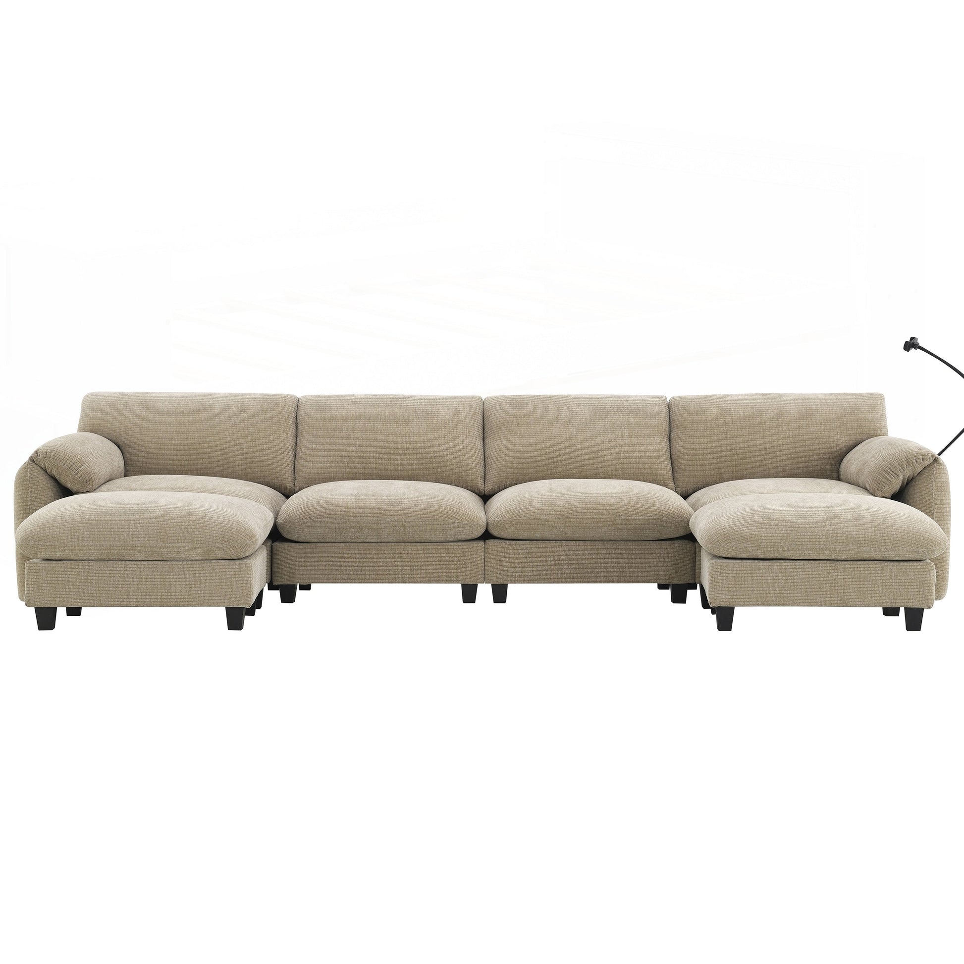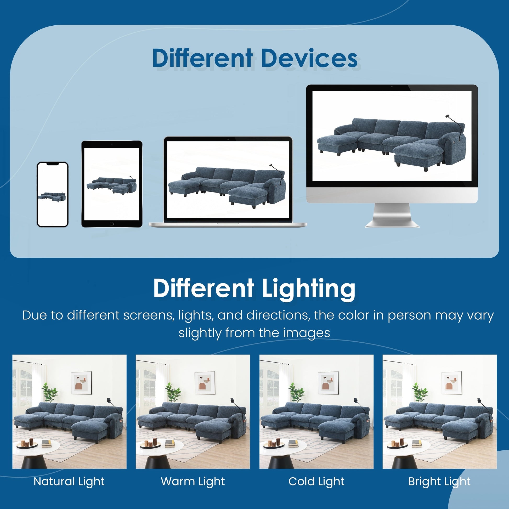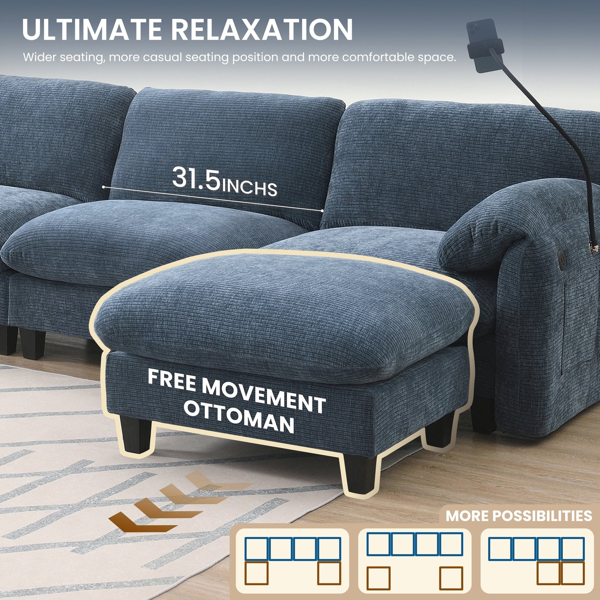 Indulge in luxury with our modular sofa, The armrest is designed with a convenient storage bag, a mobile phone holder, as well as wired and wireless charging ports, allowing you to enjoy comfortable services quickly and conveniently.soft armrest pillows, and spacious seating with extra-wide and deep dimensions. The sofa is composed of five modular components that can be freely combined. It is equipped with two movable ottomans. The free combination of various shapes can better adapt to the layout and space of your room.