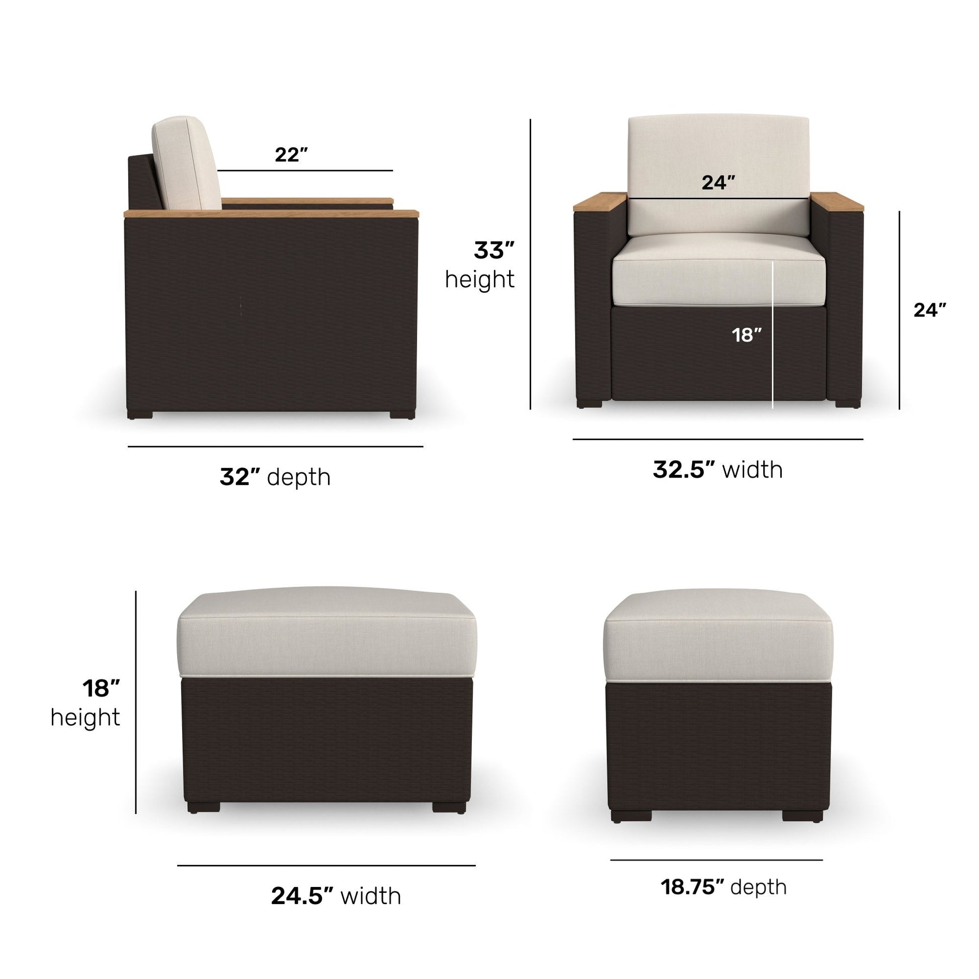Instantly transform any size patio, balcony or deck area into an inviting, comfortable haven with the Homestyles 4-Piece Palm Springs Outdoor Arm Chair and Ottoman Set. Perfect for indoor or outdoor use, the chairs are built to withstand the elements, from the weather-resistant, handwoven, rattan to the fade-resistant, cushion fabric. Thick, cozy cushions deliver lasting comfort and the covers easily unzip to clean. Solid acacia wood arms combine style and durability to keep your outdoor refuge looking sharp season after season.?