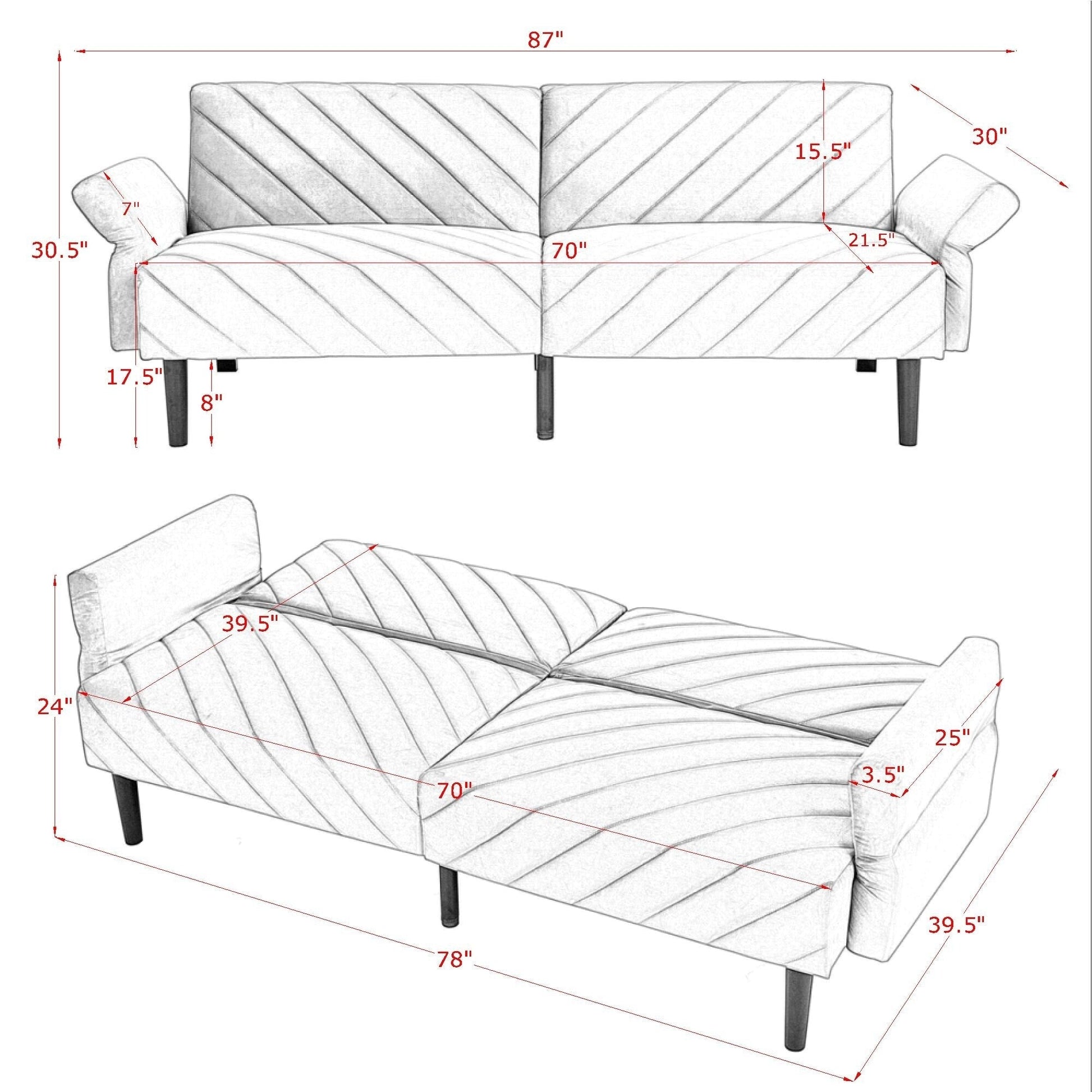 Elevate your living space with this timeless and versatile velvet futon sofa bed. Combining modern lines with mid-century modern details, such as chevron tufting and tapered plastic legs, this piece adds style to any decor. The velvet upholstery not only looks elegant but also adds extra comfort and durability, allowing you to enjoy its softness and warmth. The multi-angle adjustable armrests and backrests provide customized comfort, with the backrest adjustable in 6 positions (90° to 180° reclining), making it perfect for reading, entertainment, or sleeping. Simply pull to switch it between a sofa, bed, and recliner. Built for long-term use, the frame is made of iron and solid wood, ensuring a stable structure, while the high-density foam provides firm and comfortable support that will not deform. The adjustable armrests offer more sleeping space, allowing you to stretch comfortably on the sofa bed instead of curling up. The sleeper area measures 87' x 39.5' x 17.5', providing ample space for relaxation.